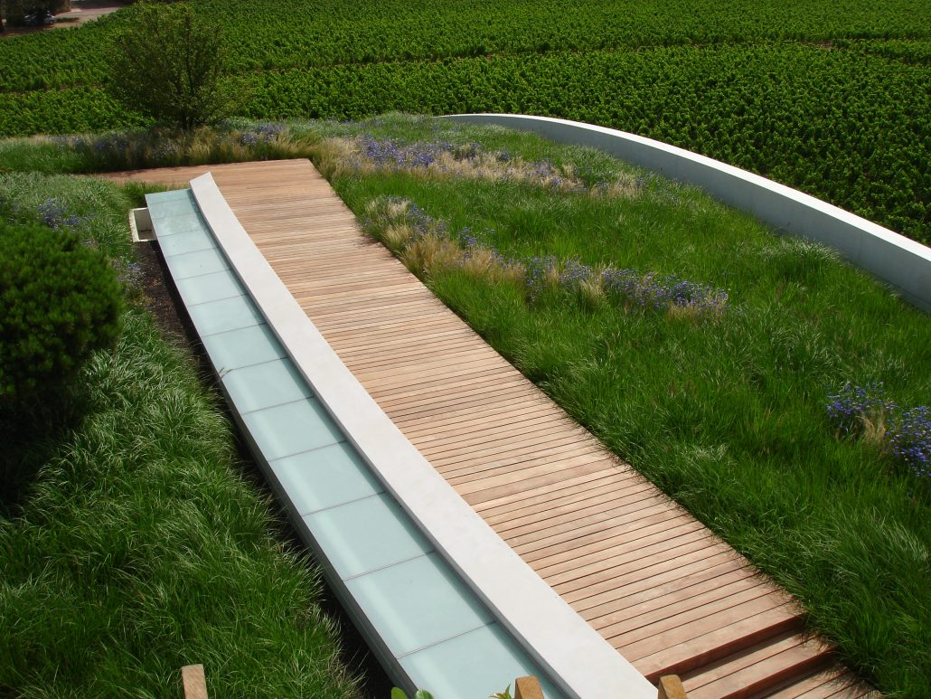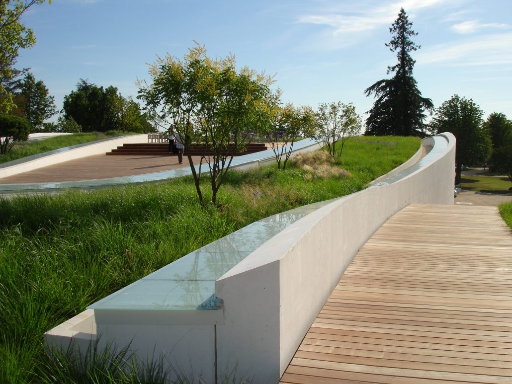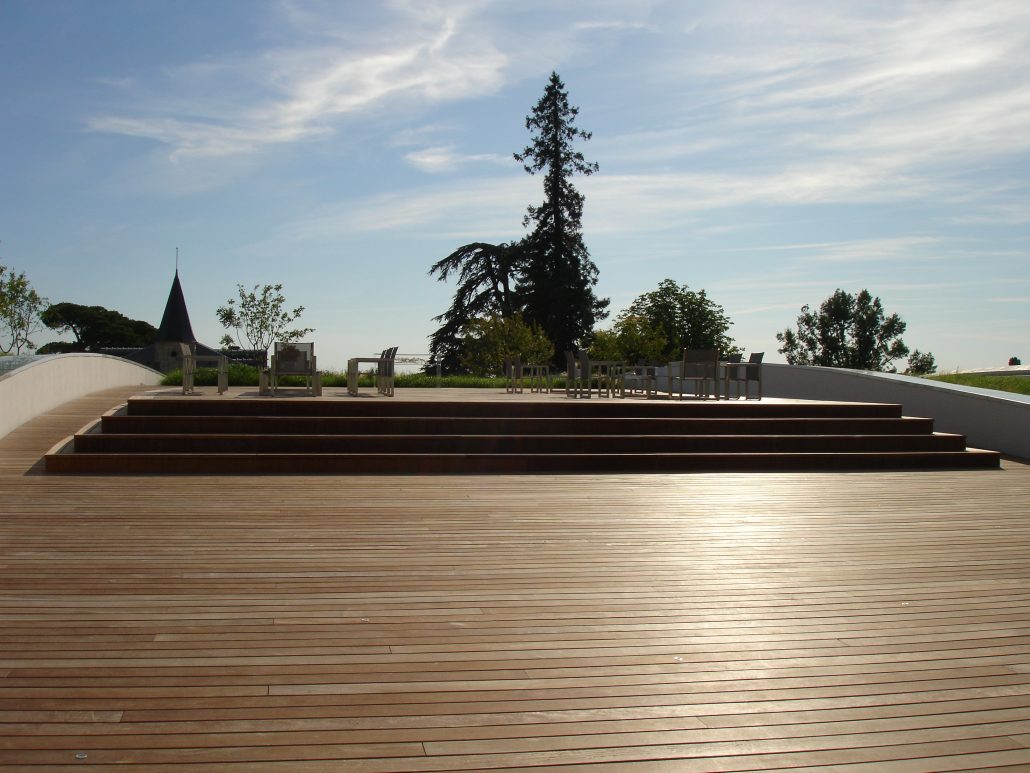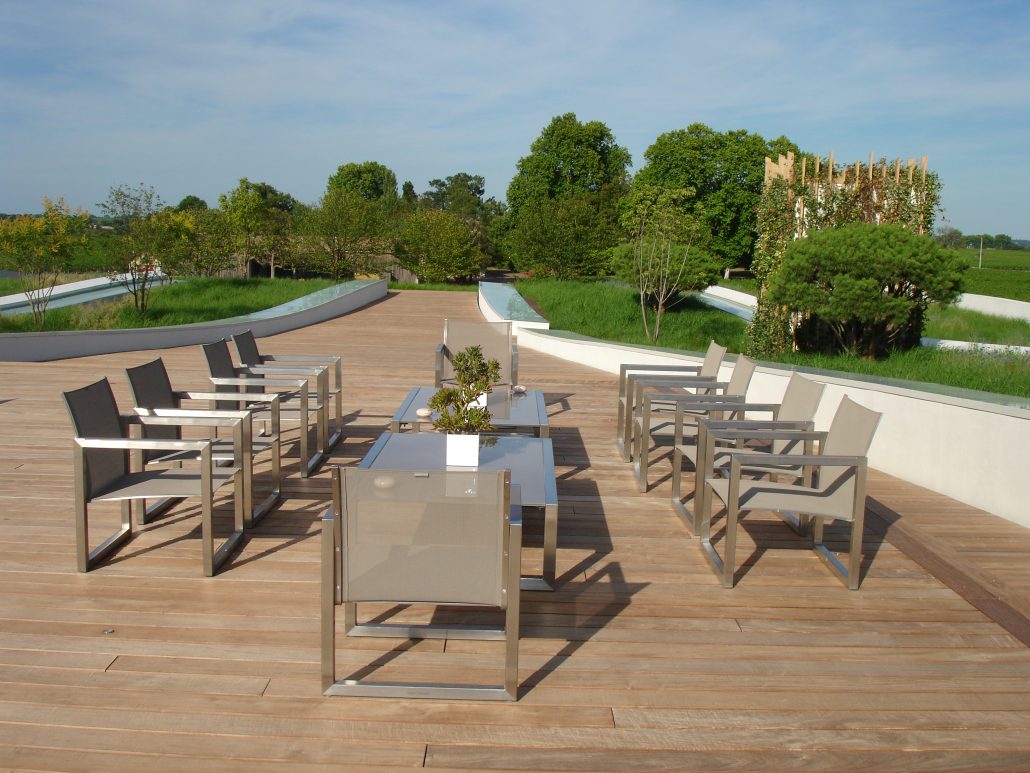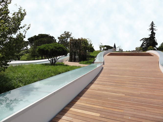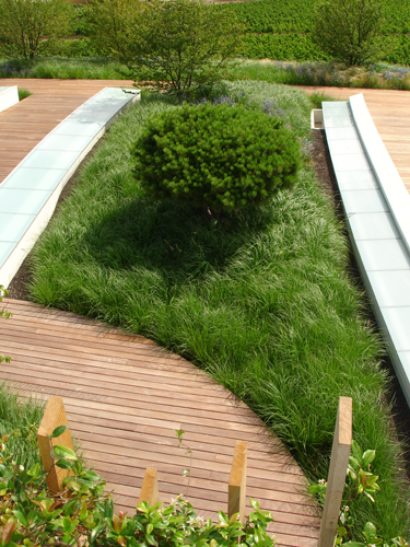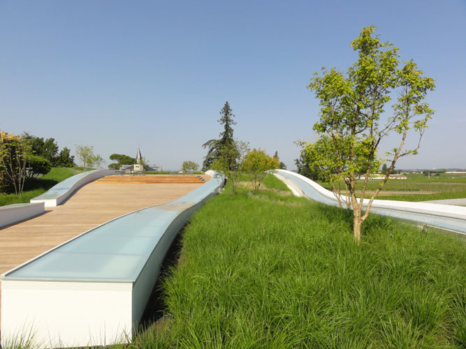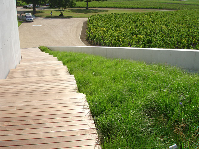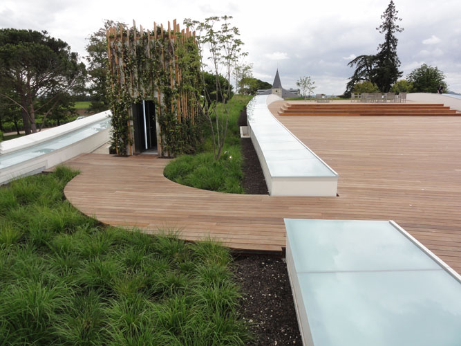 Chaque visiteur peut fouler le toit de la coque protectrice transformé en jardins. Son concepteur, le paysagiste Régis Guignard, appelle cette immense terrasse « la crinière », ses mouvements ondulatoires se poursuivant là-haut sur un « terrain » de 76 m de long et 44 m de large. Pour y parvenir, il suffit d’emprunter un grand escalier extérieur aux marches d’ipé, bordées d’une bande de prairie montante de Graminée qui va s’élargissant. Entre les longues touffes vertes, on aperçoit les fleurs bleutées des géraniums australiens et les petites coques grises des spots d’éclairage. « Nous avons fabriqué un point de vue » souligne Régis Guignard depuis ce belvédère aménagé 12 m au-dessus du sol et lançant la formule de « paysage spontané » pour qualifier cette terrasse en mouvements, « en contraste avec l’ordonnancement martial du vignoble ».