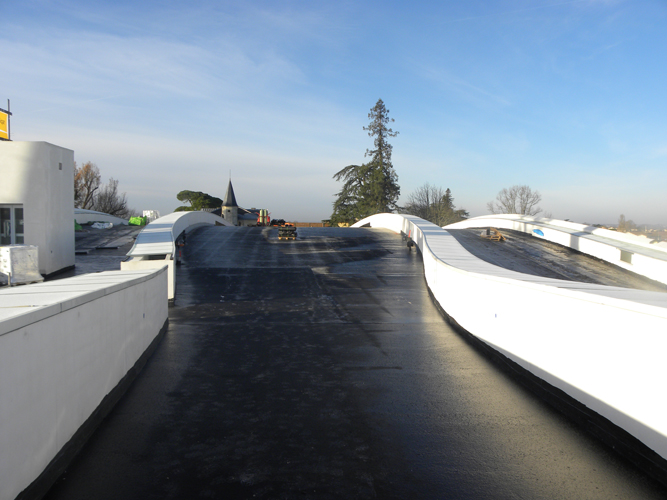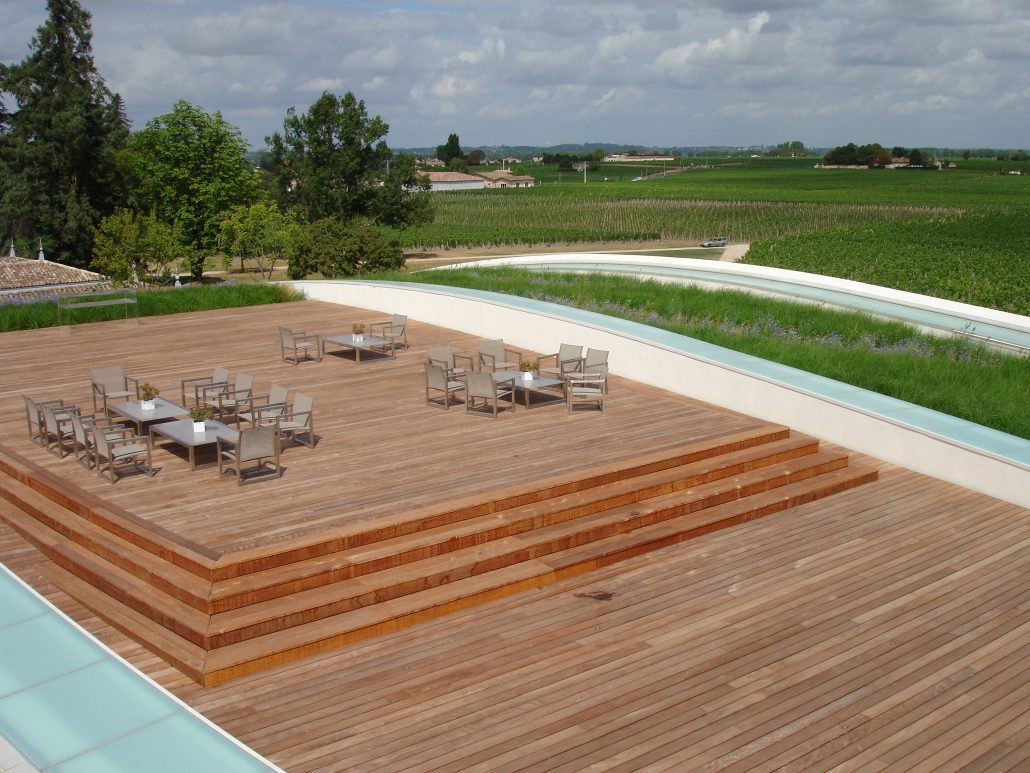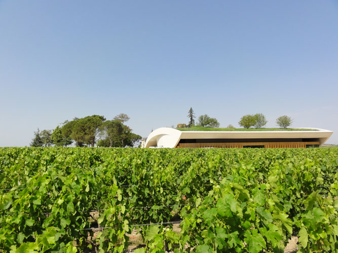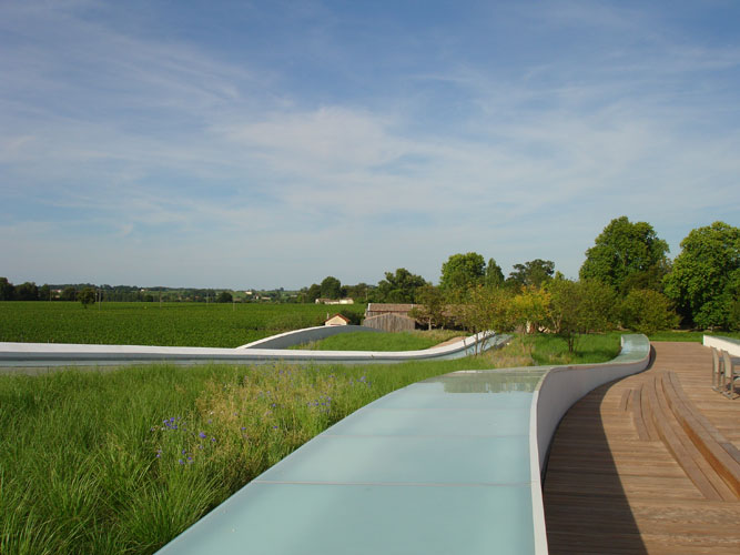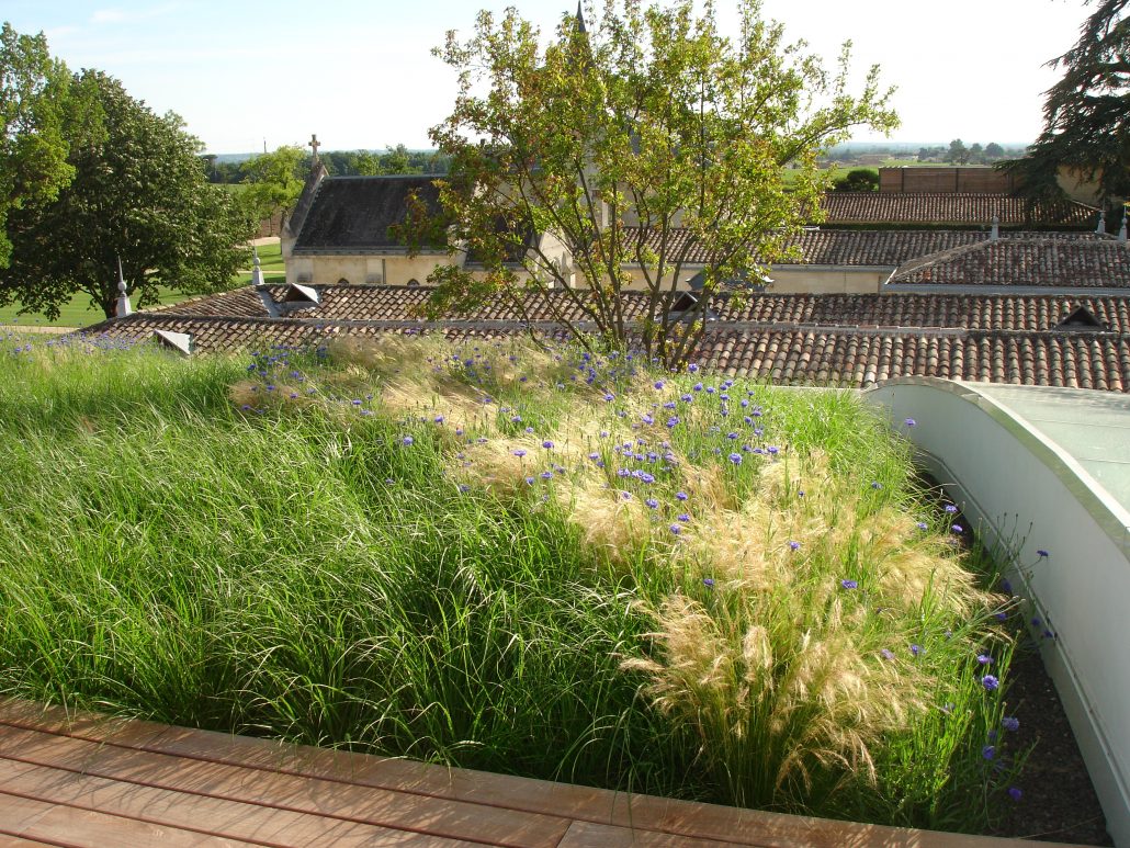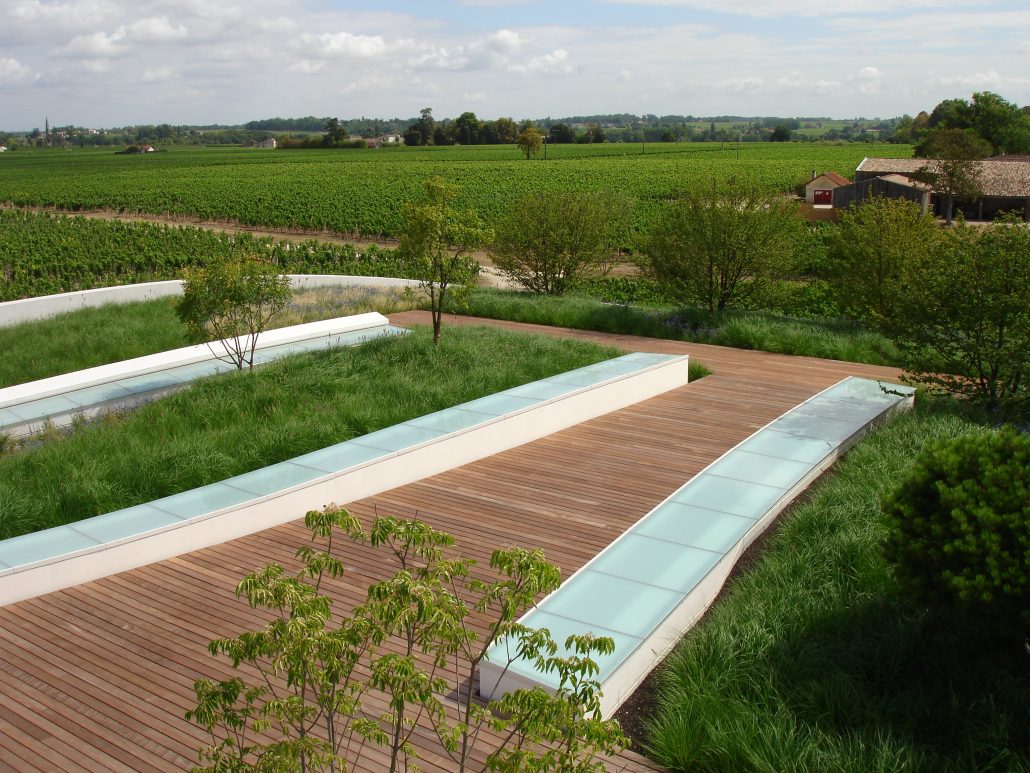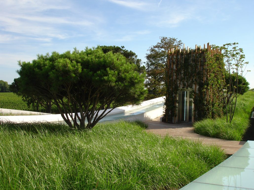 Un jardin suspendu de 3 100 m 2 a été aménagé sur la terrasse du chai métamorphosé en belvédère du prestigieux vignoble Saint-Émilion. Un pari paysager traité avec rigueur, simplicité et efficacité. Posé sur les 37 ha de son vignoble, le nouveau chai du grand crû Saint-Émilion Château Cheval Blanc dessiné par Christian de Portzamparc qui ignore les lignes droites. Celles des rangs de vignes disciplinés qui l’entourent à perte de vue comme celles de l’ordonnance du château. Ses formes de béton tout en courbes, au-dedans et au-dehors, rompent avec le jeu orthogonal et propose un nouvel équilibre. Cette étrange et harmonieuse silhouette ondulante de blanc immaculé habille « les grandes orgues » de Pierre Lurton.