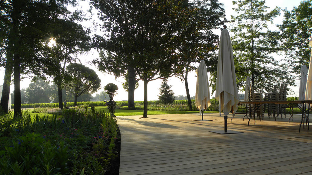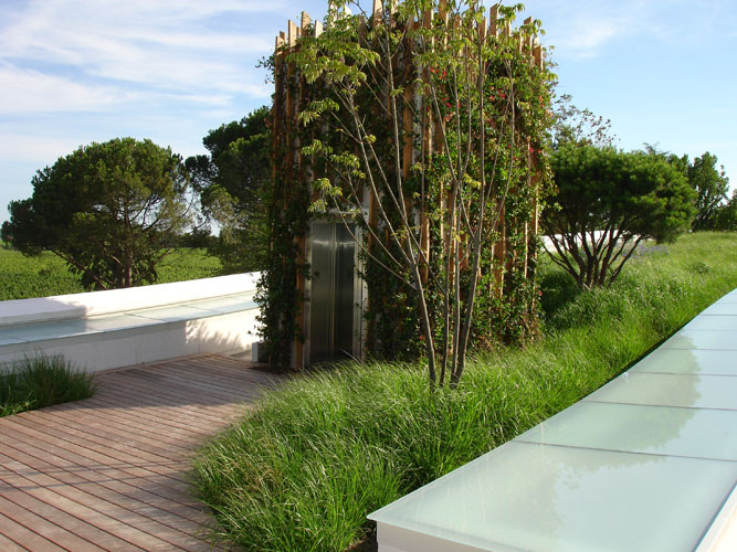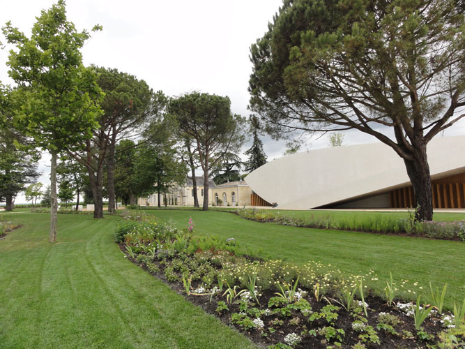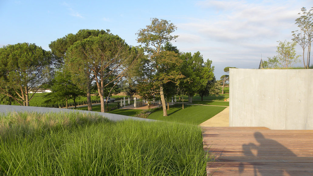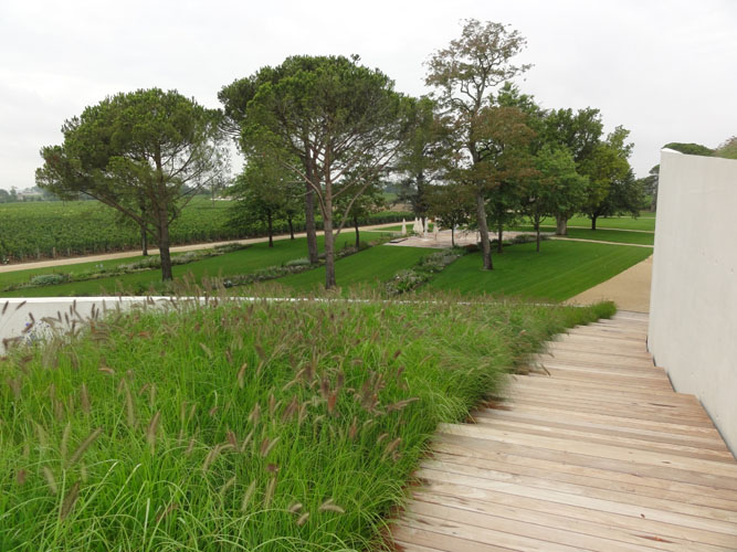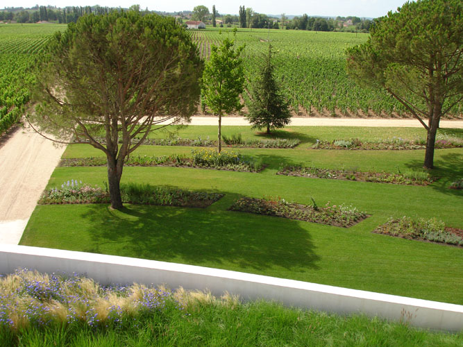 Une quinzaine d’arbustes et d’arbres émerge de temps à autre tous en cépée « pour ne pas introduire de disproportion avec le chai » précise le paysagiste. Ces repères arboricoles et arbustifs fonctionnent aussi comme « raccords » avec les bouquets d’arbres environnant, que ce soient les grands pins et les cèdres de Château ou les grands sujets des domaines voisins en perspective. La cage de l’ascenseur a été traitée en chèvrefeuille et les voiles de béton du chai seront à terme recouverts de vigne vierge. Pour de prochaines tranches, se profile un projet de miroir d’eau devant le chai et la plantation d’une collection de chênes, le bois qui fait le vin.