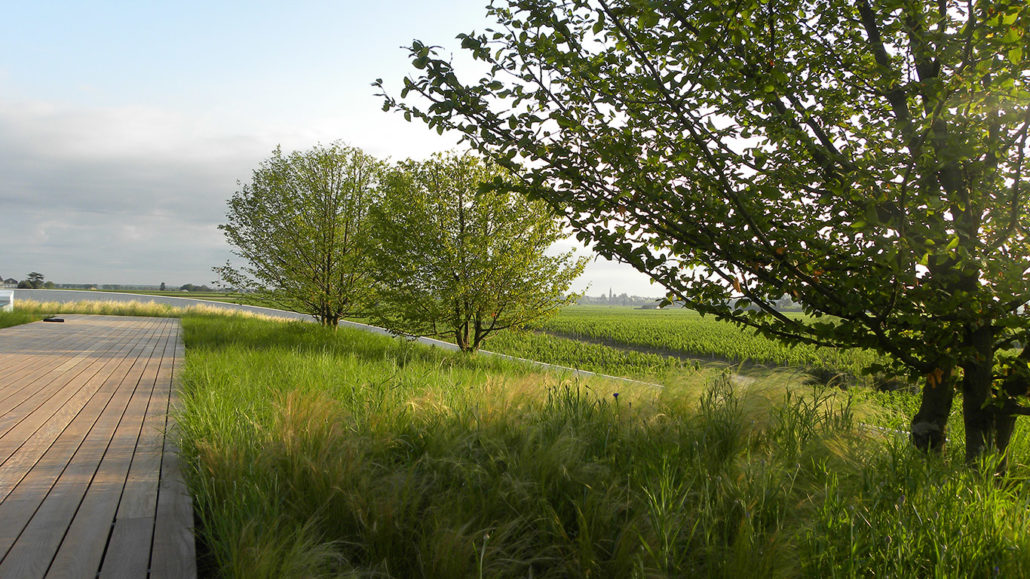 Au niveau des plantations de faibles hauteurs, une cinquantaine d’espèces de plantes et d’arbres compose un parterre qui repose avant tout sur « beaucoup d’exigences ». « Nous avons voulu rester simples, efficaces, essentiels. Pour enraciner toutes ces graminées qui ondulent sous le vent il a fallut répartir une épaisseur de 40 cm de terre (composée de 80 % de sable et de 20 % de substrat avec un peu de mulch). Graminée pennisetum et Deschampsia cespitosa ont été sélectionnées pour leur taille, leur forme et leur couleur verte. Le tapis de graminées est animé par des semis de bleuets Centaurea et de Nigelle de Damas qui restent, avec le lin, dans la palette des bleus, des blancs ou des jaunes. Cette palette végétale constitue un clin d’œil à la végétation autrefois présente sur le site viticole. Une touche différente a été apportée avec des campanules au Sud et des geraniums australiens au Nord, l’arrosage goutte à goutte puisant sa ressource dans la nappe phréatique qui affleure.