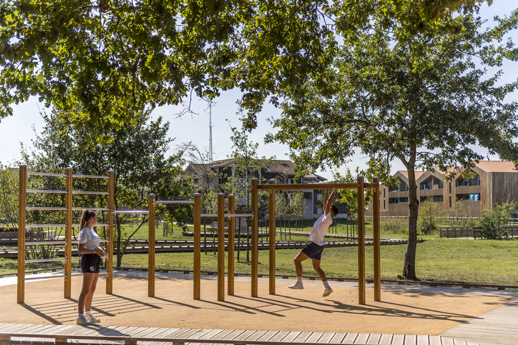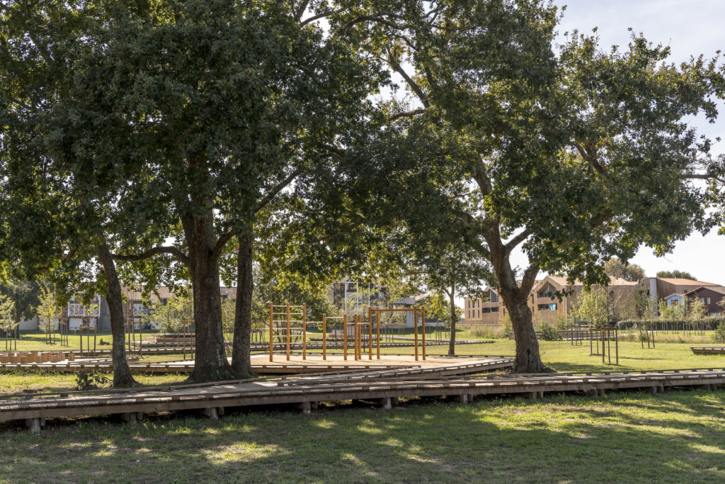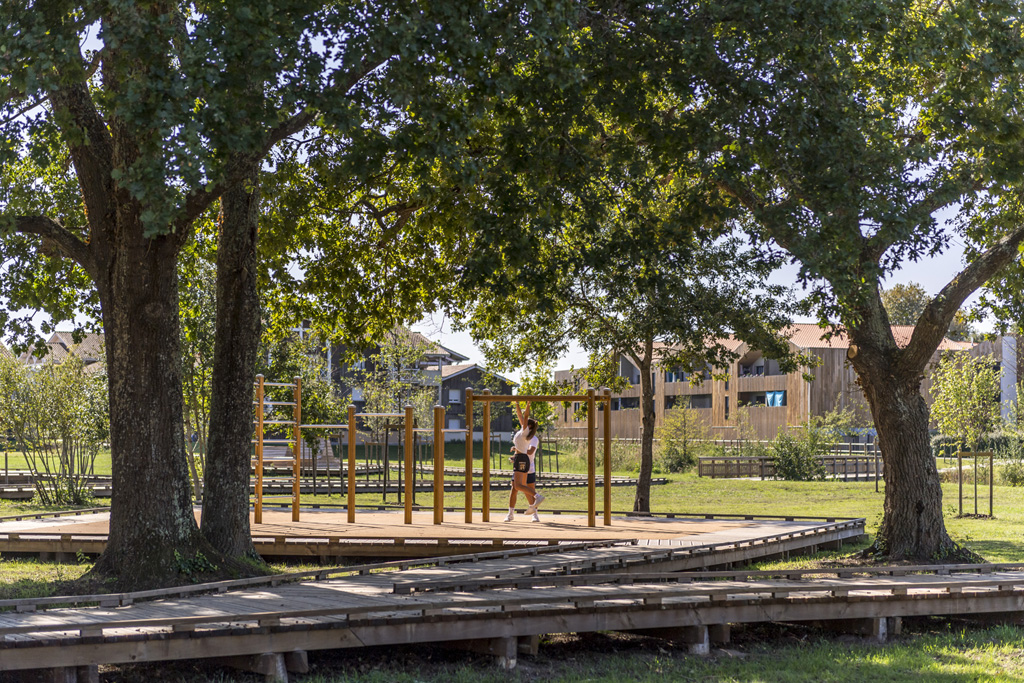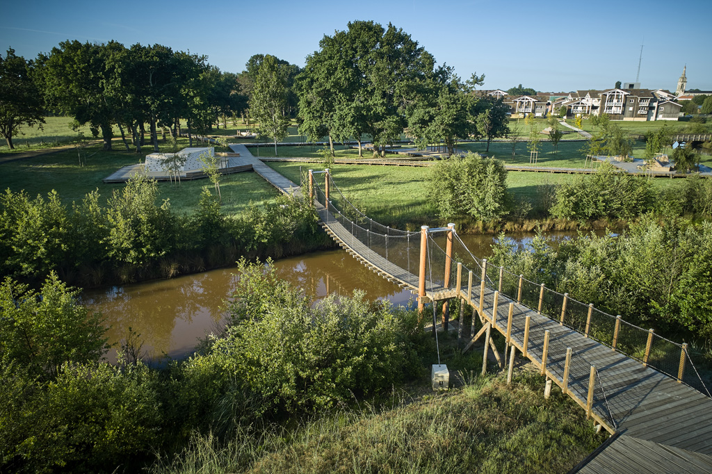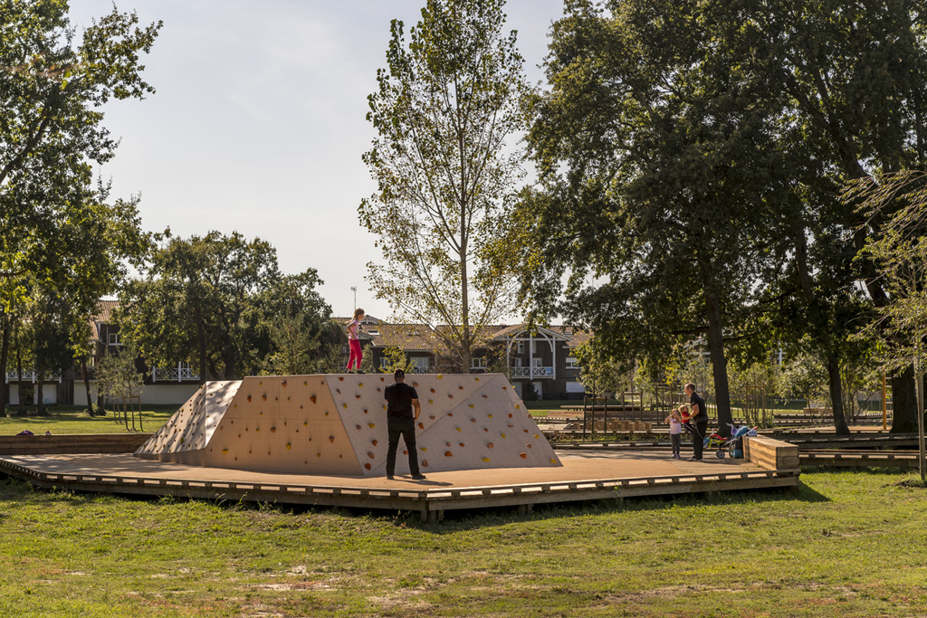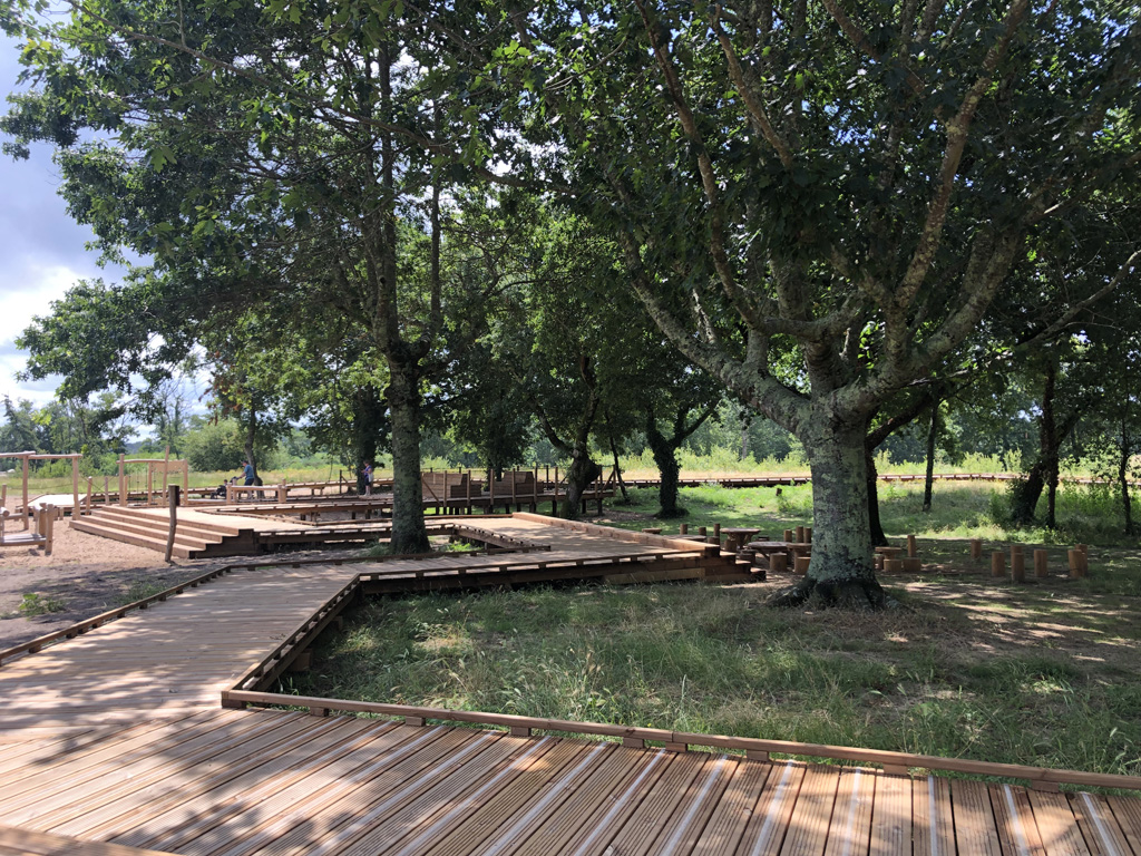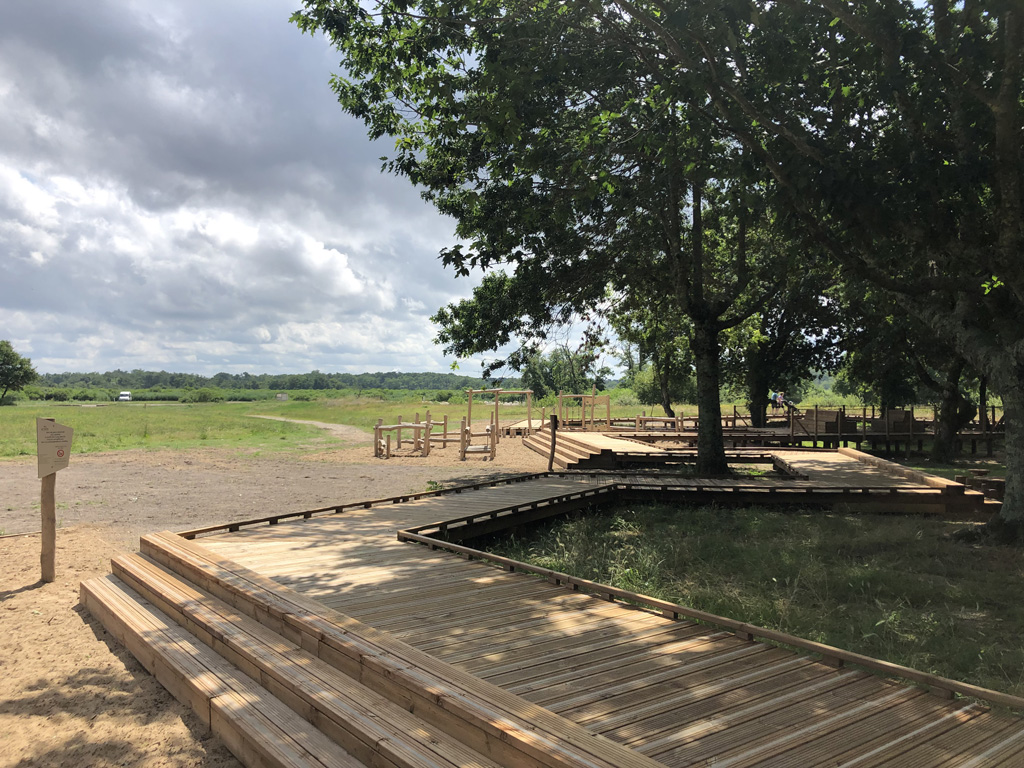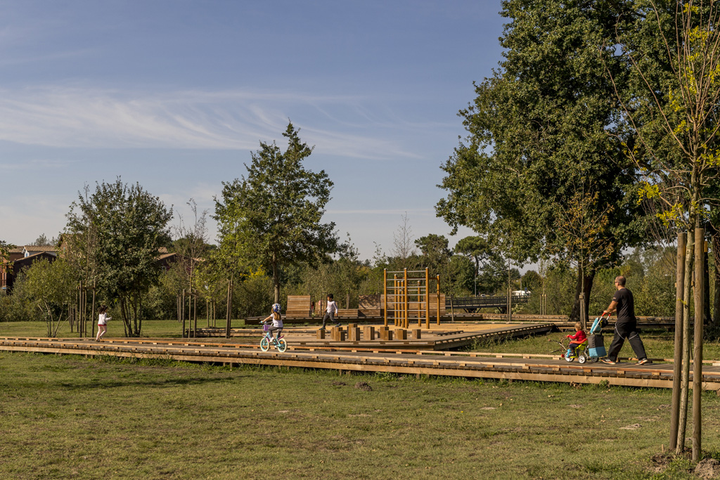 Reliant le bourg au port et au débouché de la Leyre du bassin d’Arcachon, l’aménagement du parc, vaste espace naturel de 11 hectares, propriété de la Ville, est conçu comme un espace public ludique, portant une attention toute particulière à la protection de la flore et faune du territoire investi. Pour limiter les emprises au sol, les flux piétons sont canalisés sur des cheminements hors sol, en platelage bois, serpentant au milieu des arbres, épousant la topographie. Des zones récréatives rythment ce parcours surélevé.