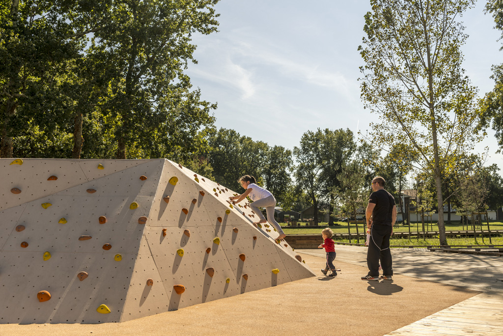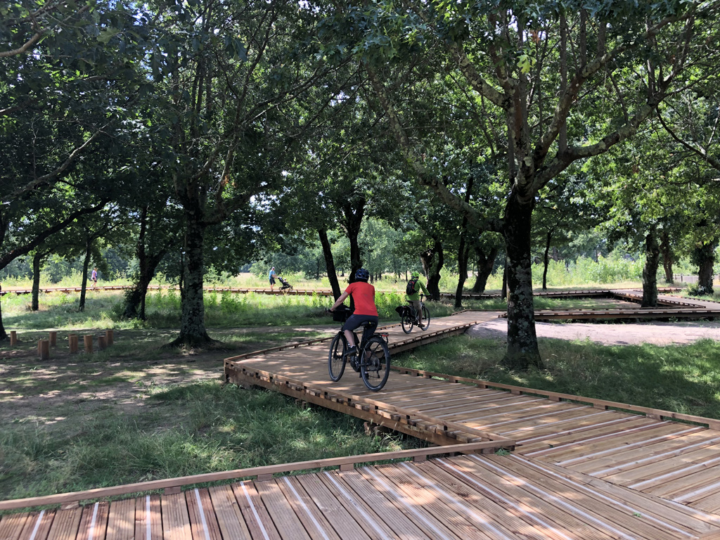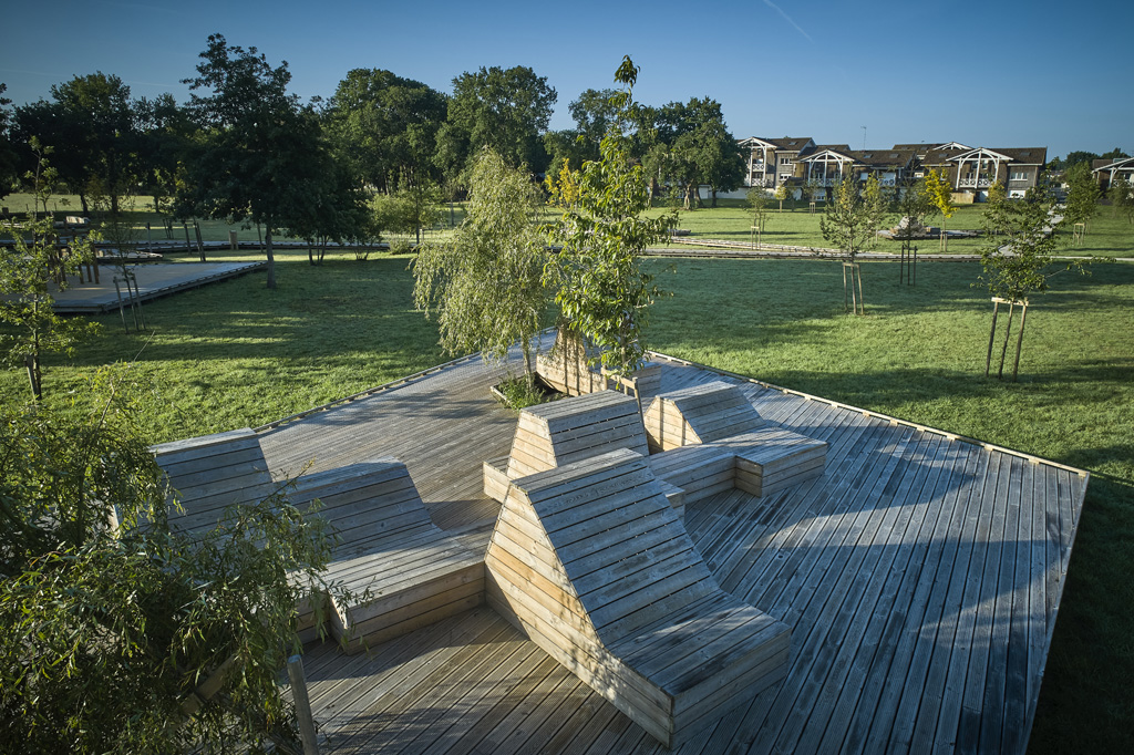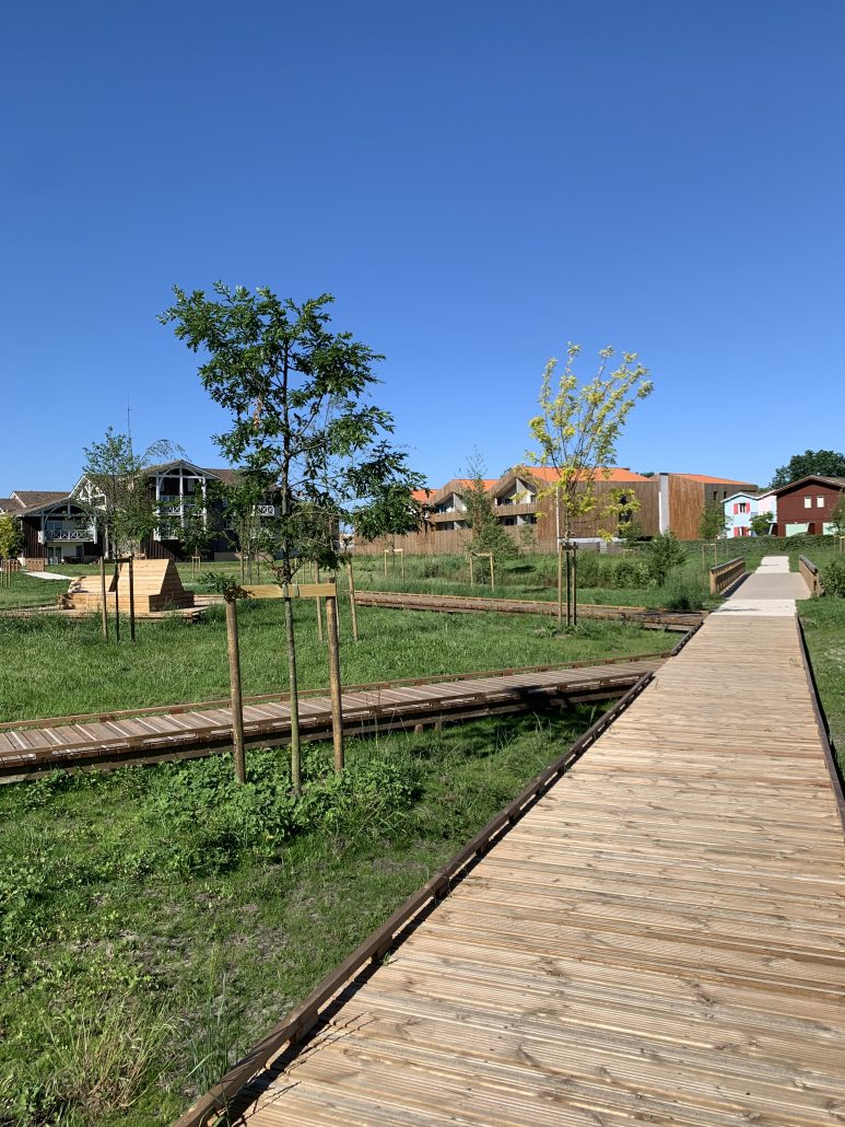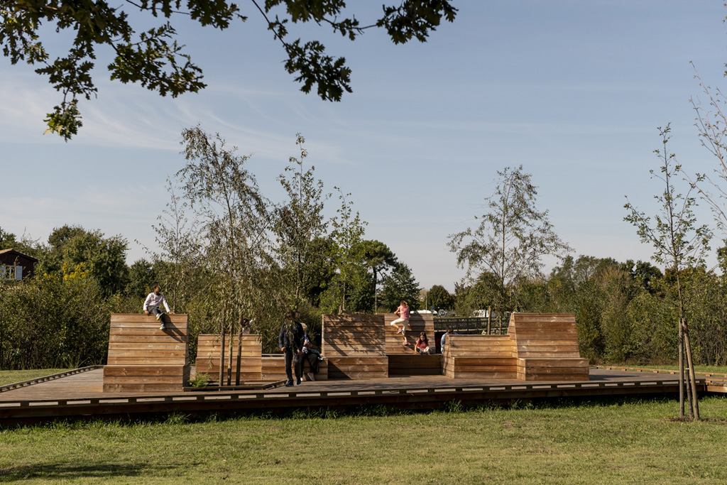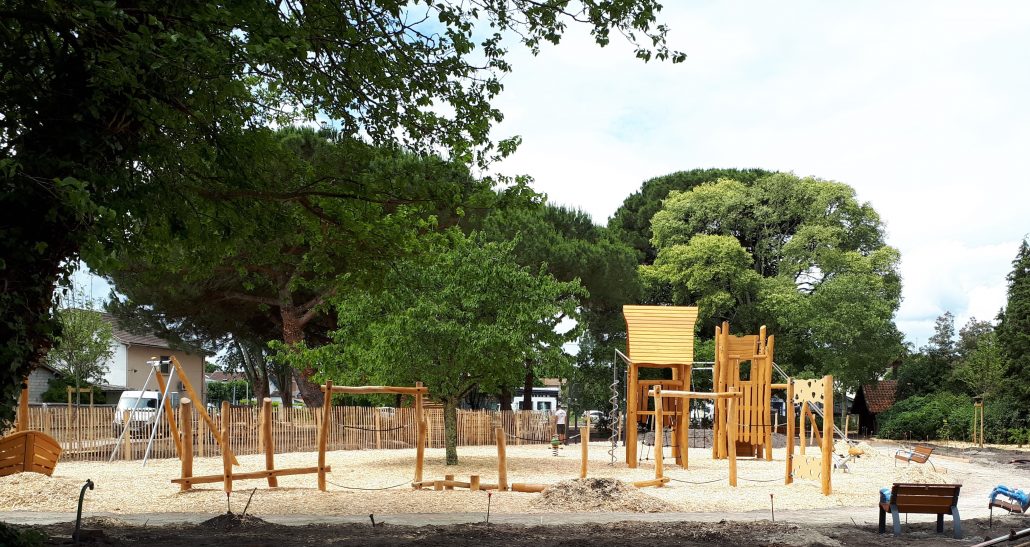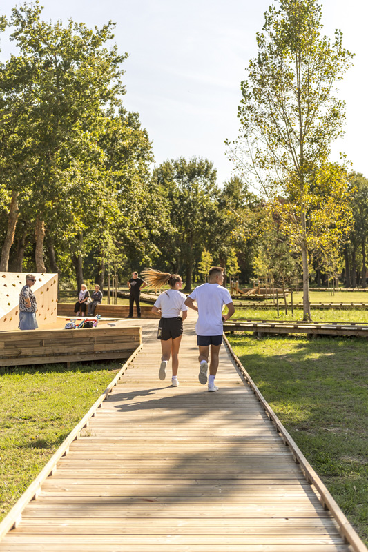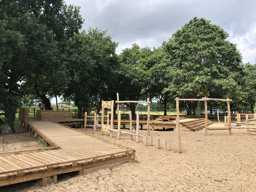 Reliant le bourg au port et au débouché de la Leyre du bassin d’Arcachon, l’aménagement du parc, vaste espace naturel de 11 hectares, propriété de la Ville, est conçu comme un espace public ludique, portant une attention toute particulière à la protection de la flore et faune du territoire investi. Pour limiter les emprises au sol, les flux piétons sont canalisés sur des cheminements hors sol, en platelage bois, serpentant au milieu des arbres, épousant la topographie. Des zones récréatives rythment ce parcours surélevé.