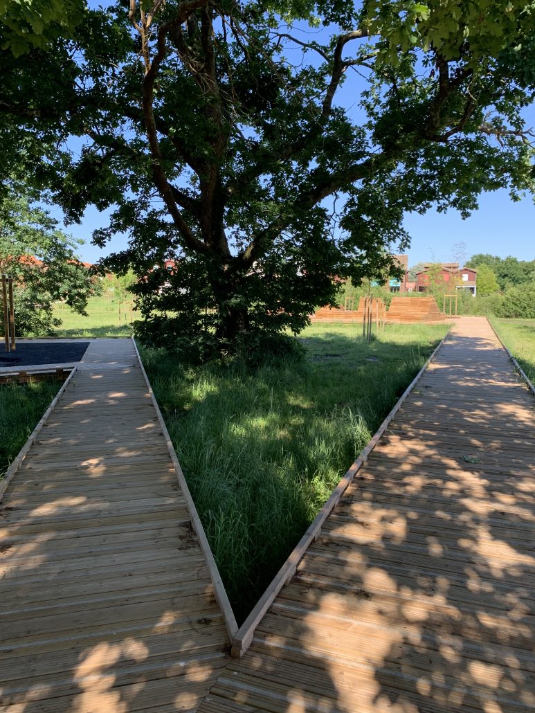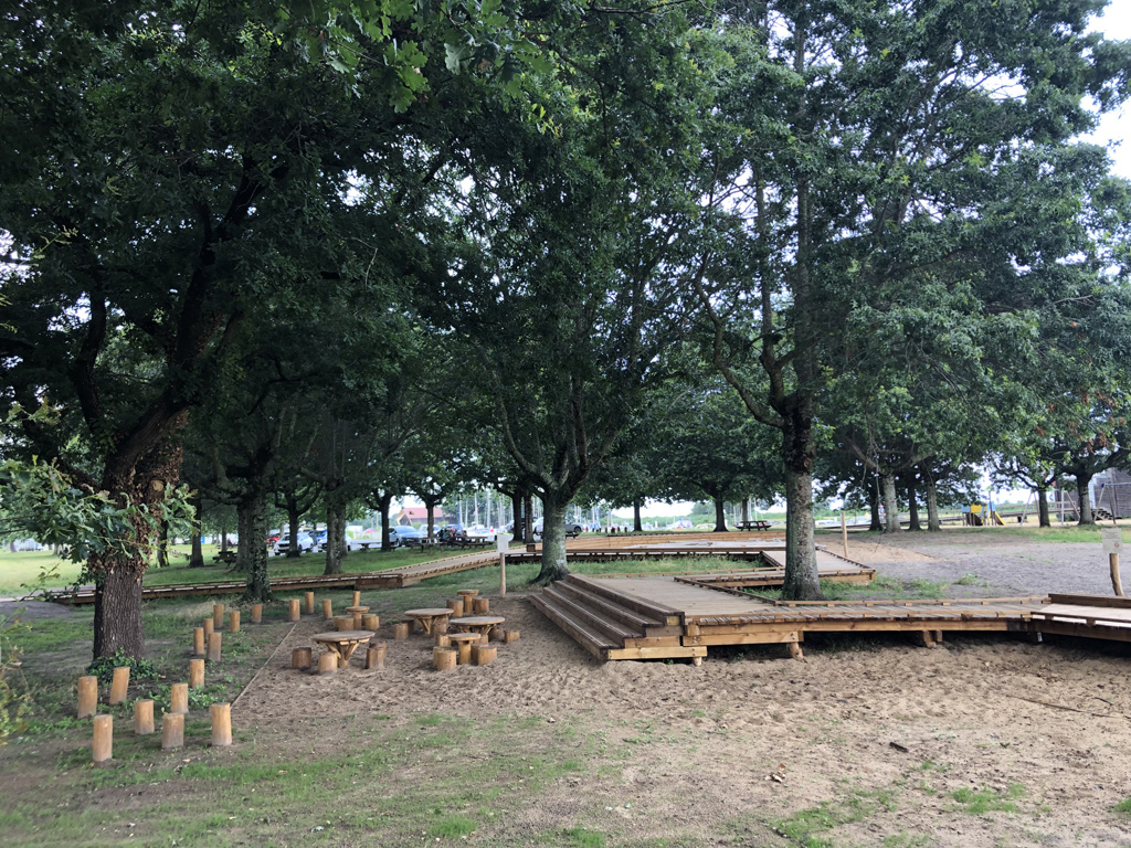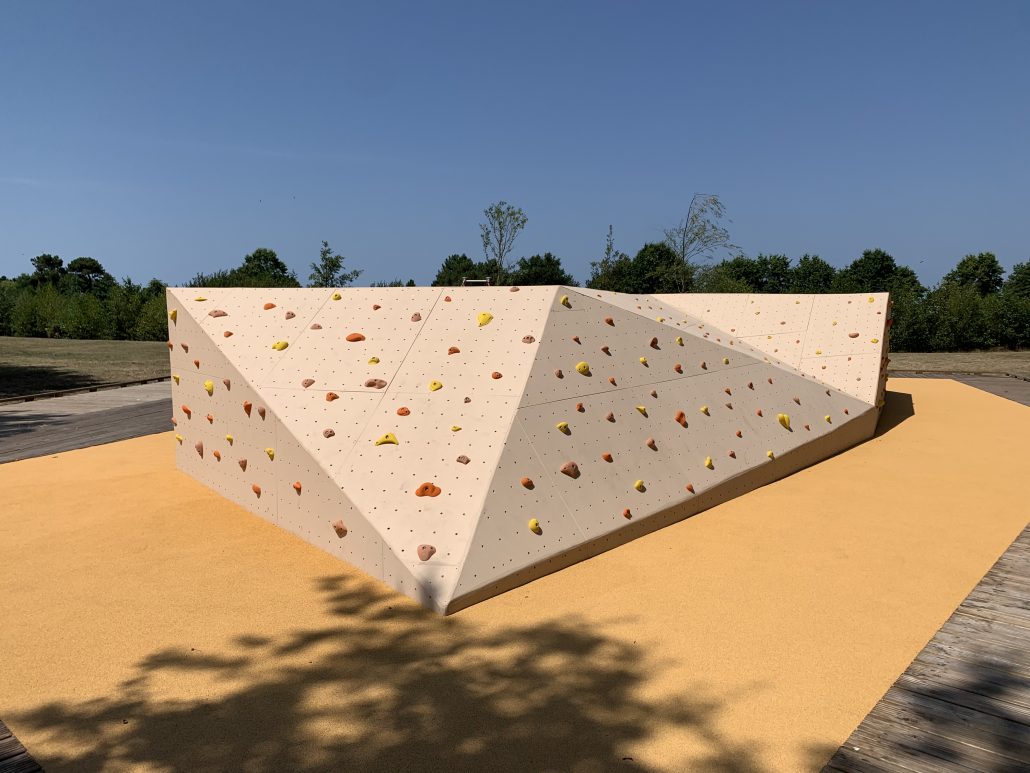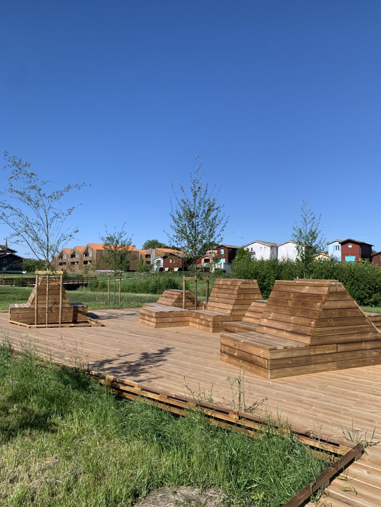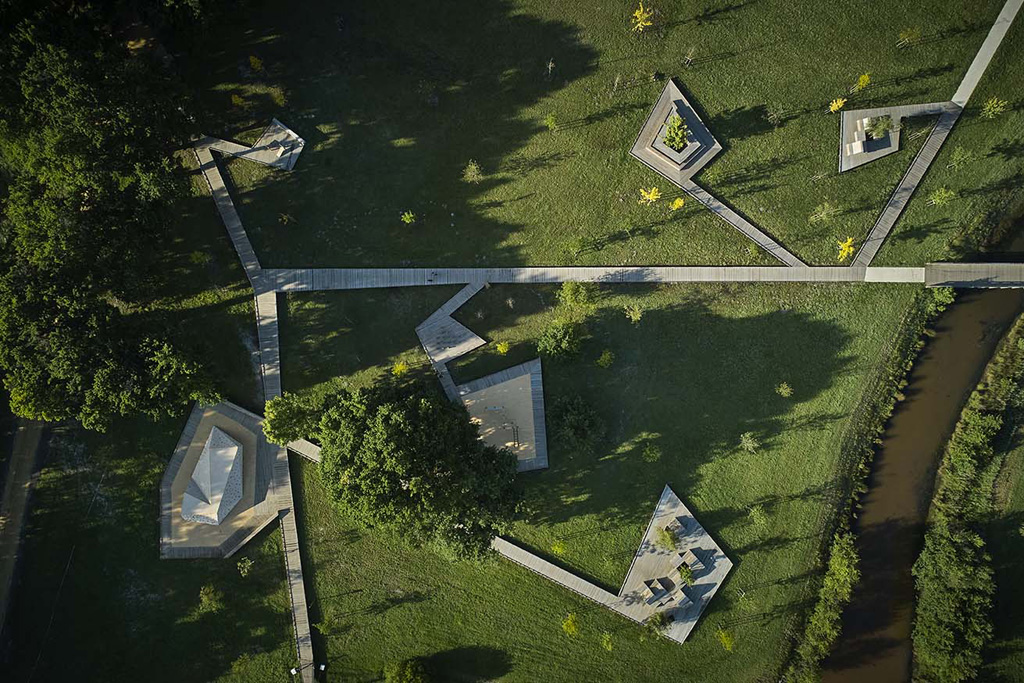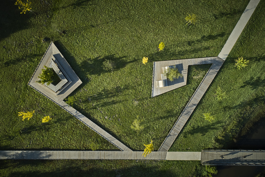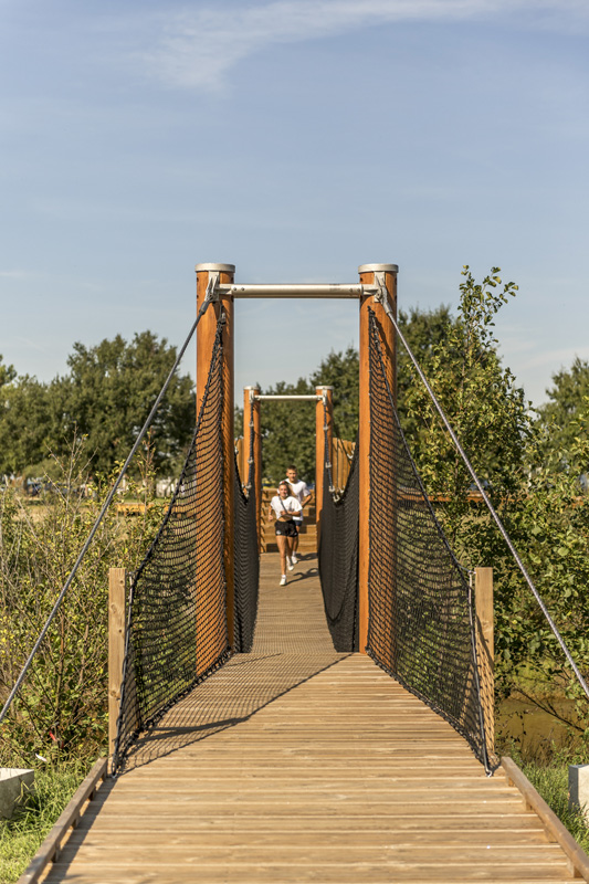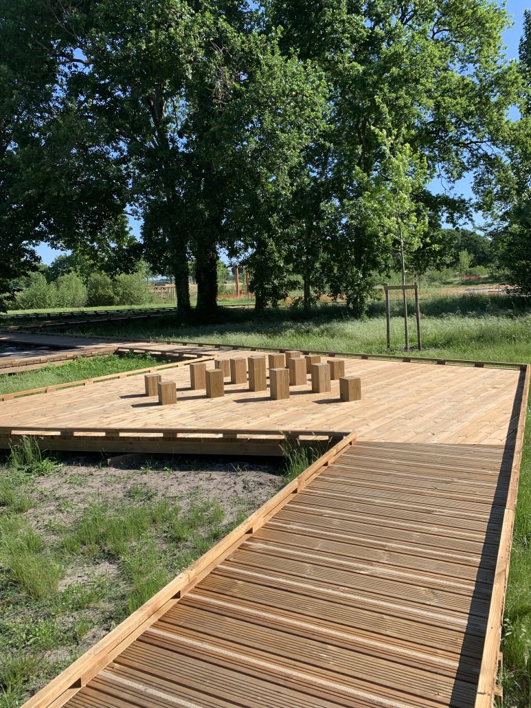 Reliant le bourg au port et au débouché de la Leyre du bassin d’Arcachon, l’aménagement du parc, vaste espace naturel de 11 hectares, propriété de la Ville, est conçu comme un espace public ludique, portant une attention toute particulière à la protection de la flore et faune du territoire investi. Pour limiter les emprises au sol, les flux piétons sont canalisés sur des cheminements hors sol, en platelage bois, serpentant au milieu des arbres, épousant la topographie. Des zones récréatives rythment ce parcours surélevé.