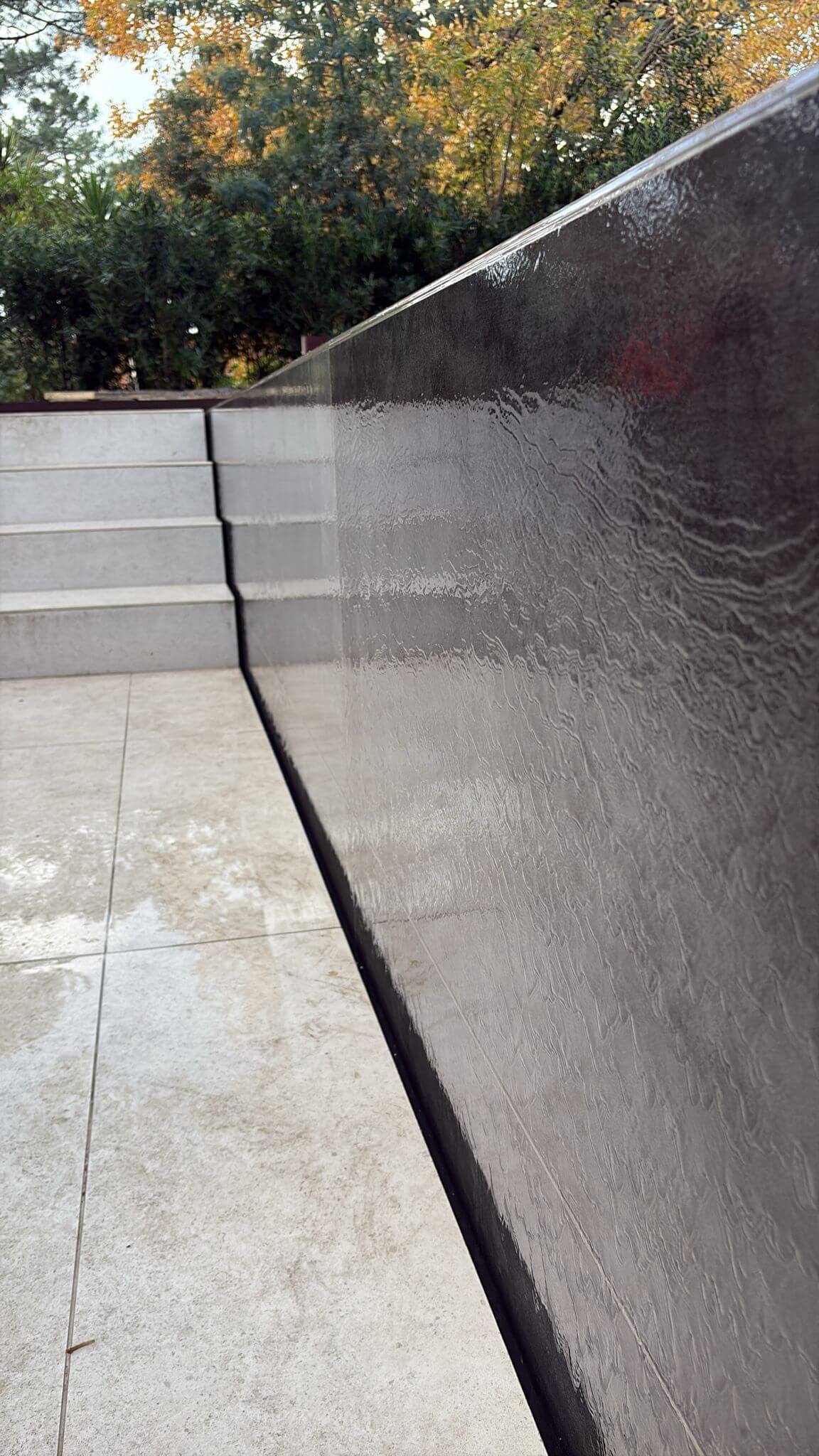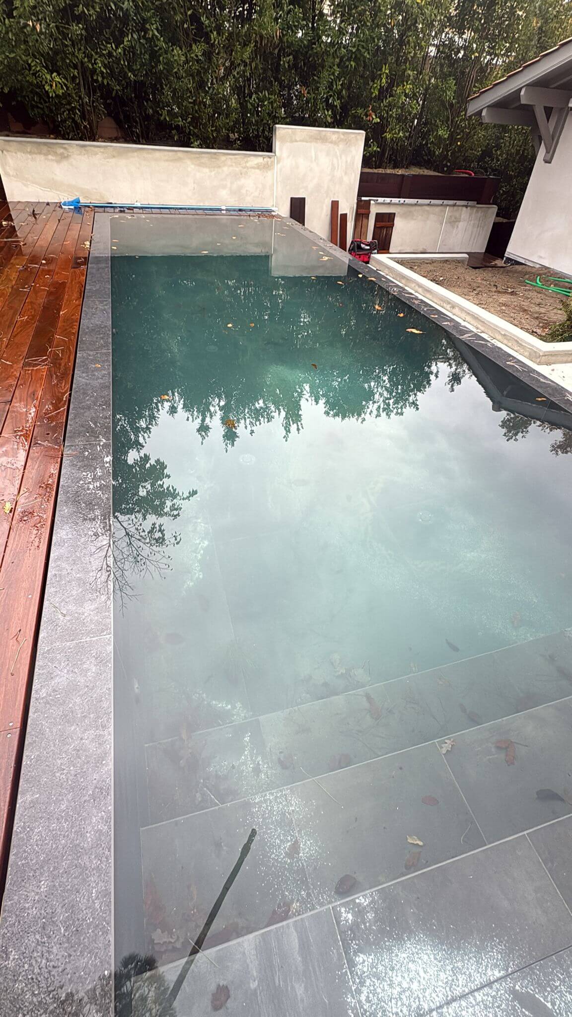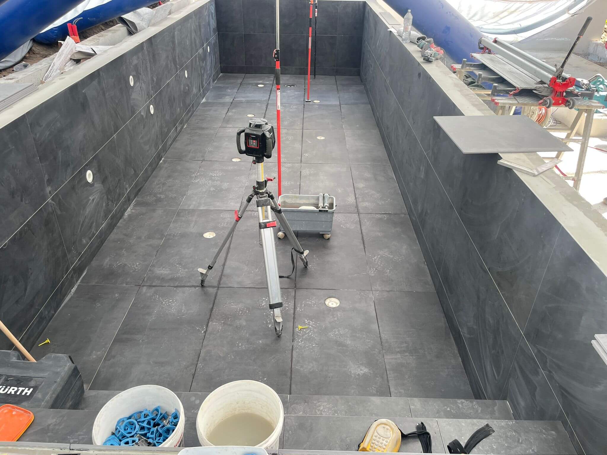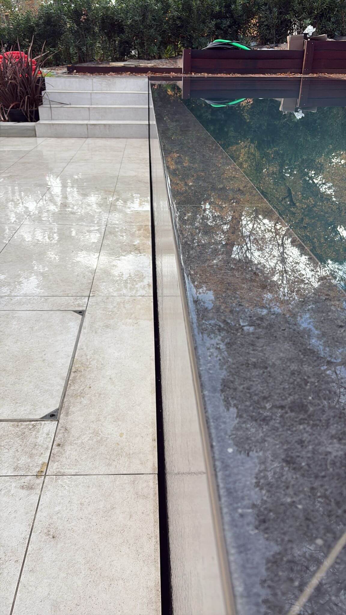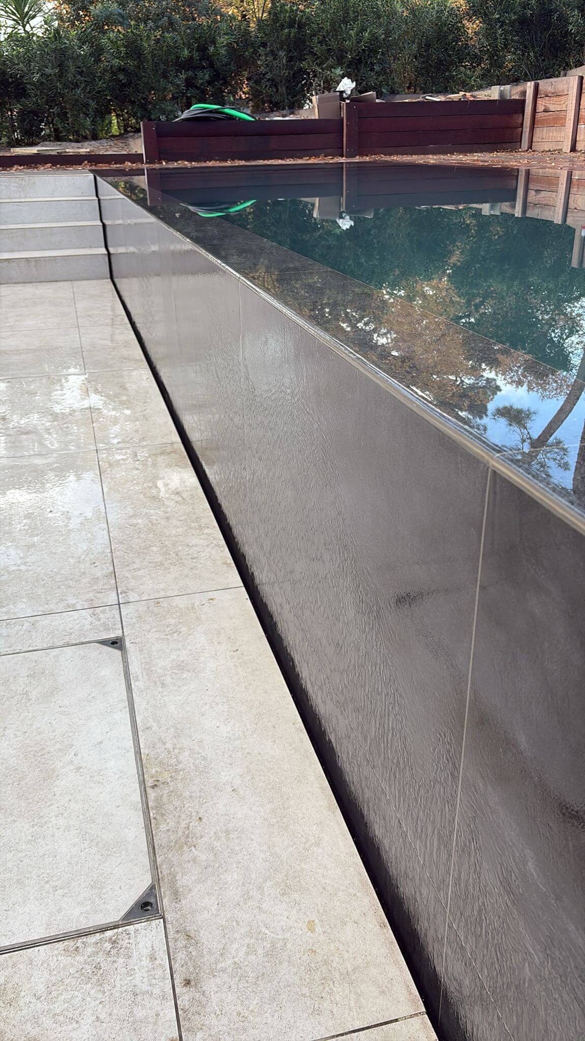 Le bassin est habillé d’un carrelage en grès cérame 9 mm du fabricant Rosa Gres, reconnu pour la qualité et la durabilité de ses matériaux en milieu aquatique. La pose a été réalisée par notre carreleur spécialisé piscine, garantissant un rendu précis, élégant et parfaitement adapté aux contraintes techniques d’un bassin. Ce projet intègre un volet immergé dissimulé sous la banquette, de la marque T&A. Cette solution allie sécurité conforme à la réglementation, esthétisme et compatibilité avec le débordement du bassin.