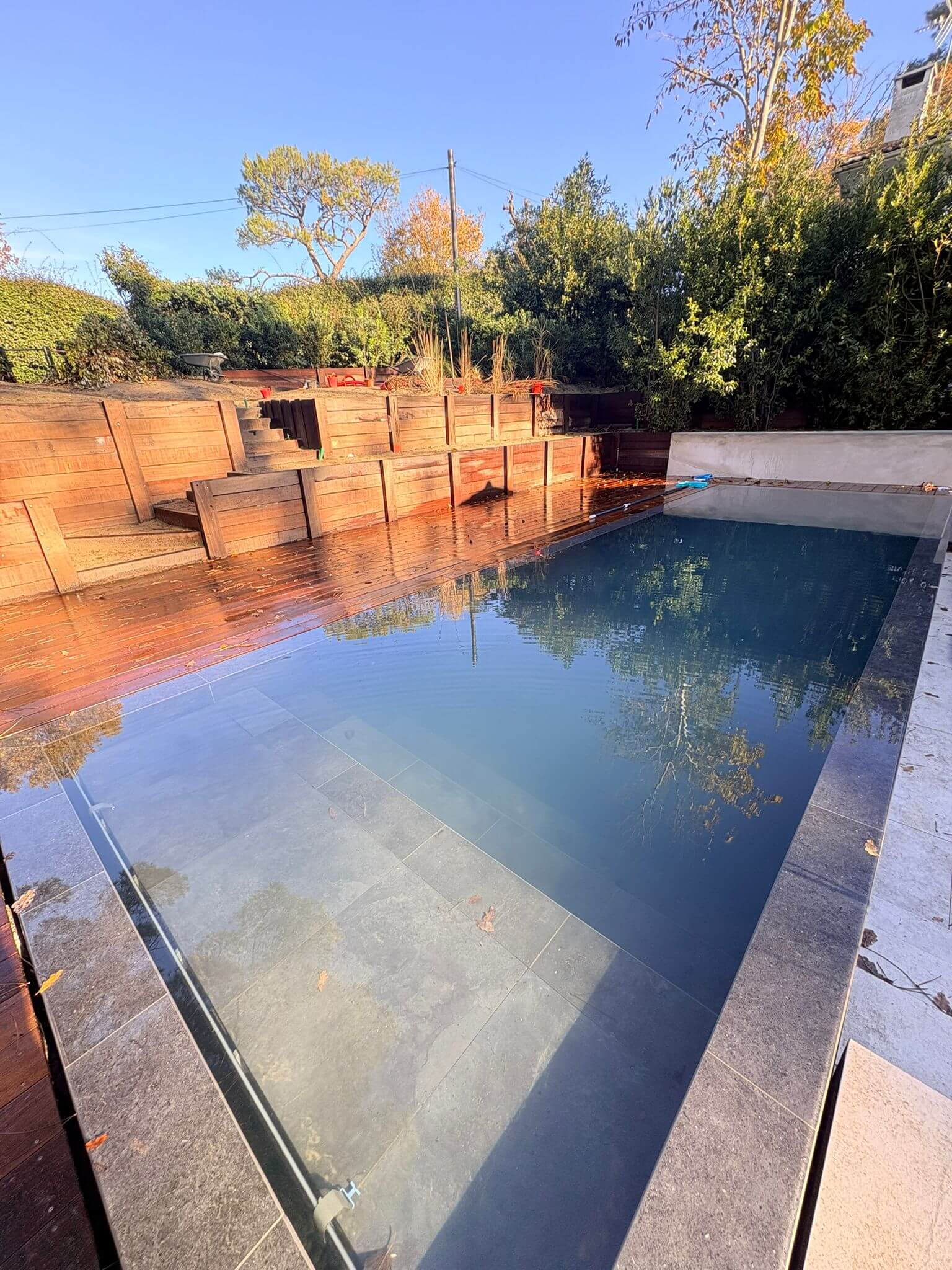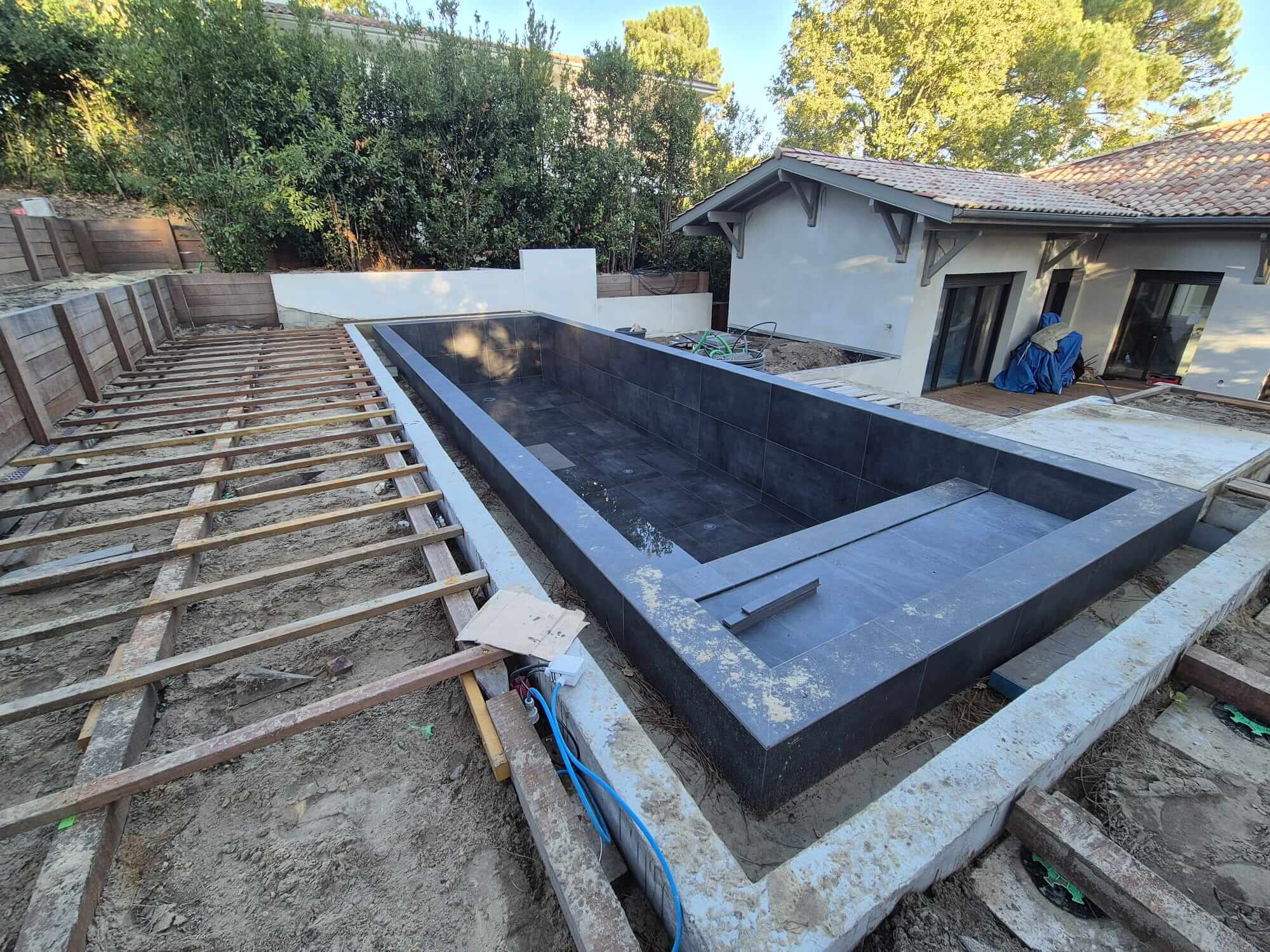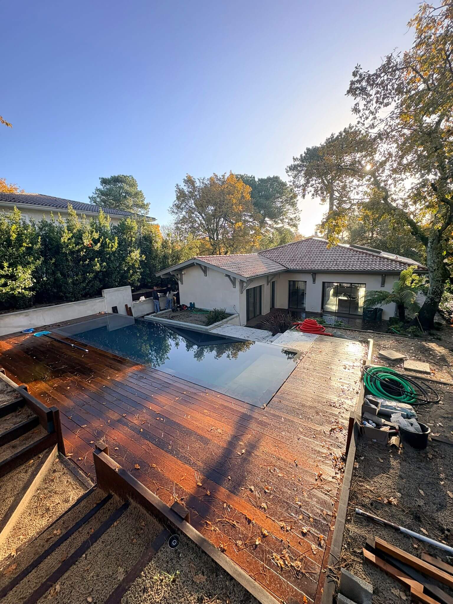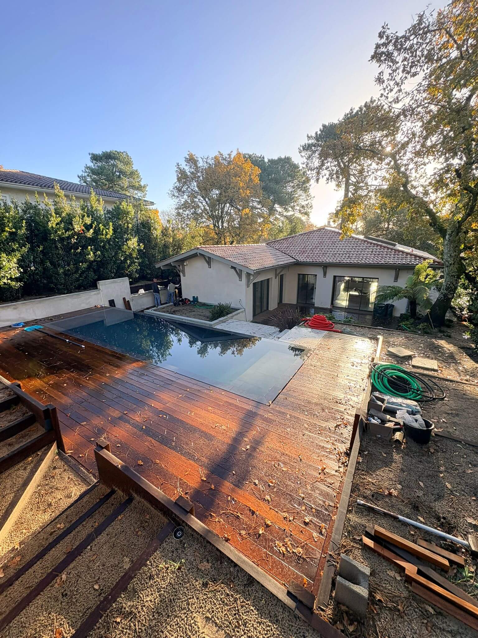 Type d’aménagement : conception, filtration, débordement, carrelage, électrolyseur, pompe à chaleur et volet immergé.