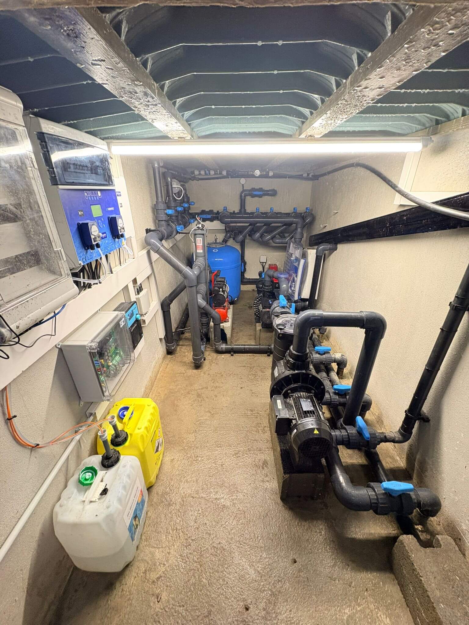 Côté traitement et gestion automatisée, la piscine est équipée d’un électrolyseur au sel Klereo Master M9 Hybride, permettant une gestion complète en domotique via l’application, grâce au kit de connexion Podeo. L’éclairage du bassin est assuré par des projecteurs Mini Brio Blanc, offrant une mise en valeur sobre et efficace à la tombée de la nuit. Une vanne automatique Besgo 5 voies avec remplissage automatique a également été intégrée pour optimiser la gestion du niveau d’eau et simplifier l’entretien.