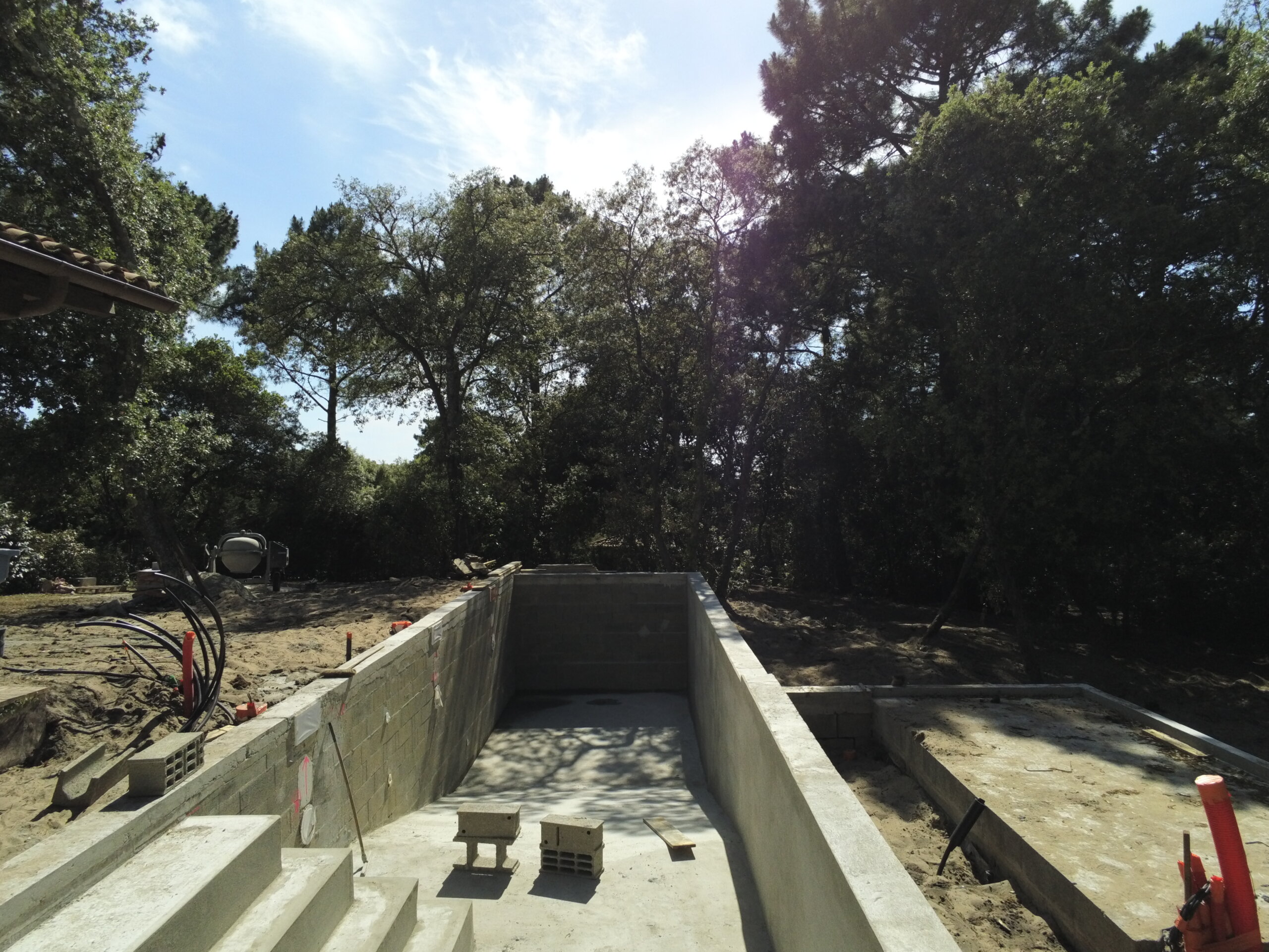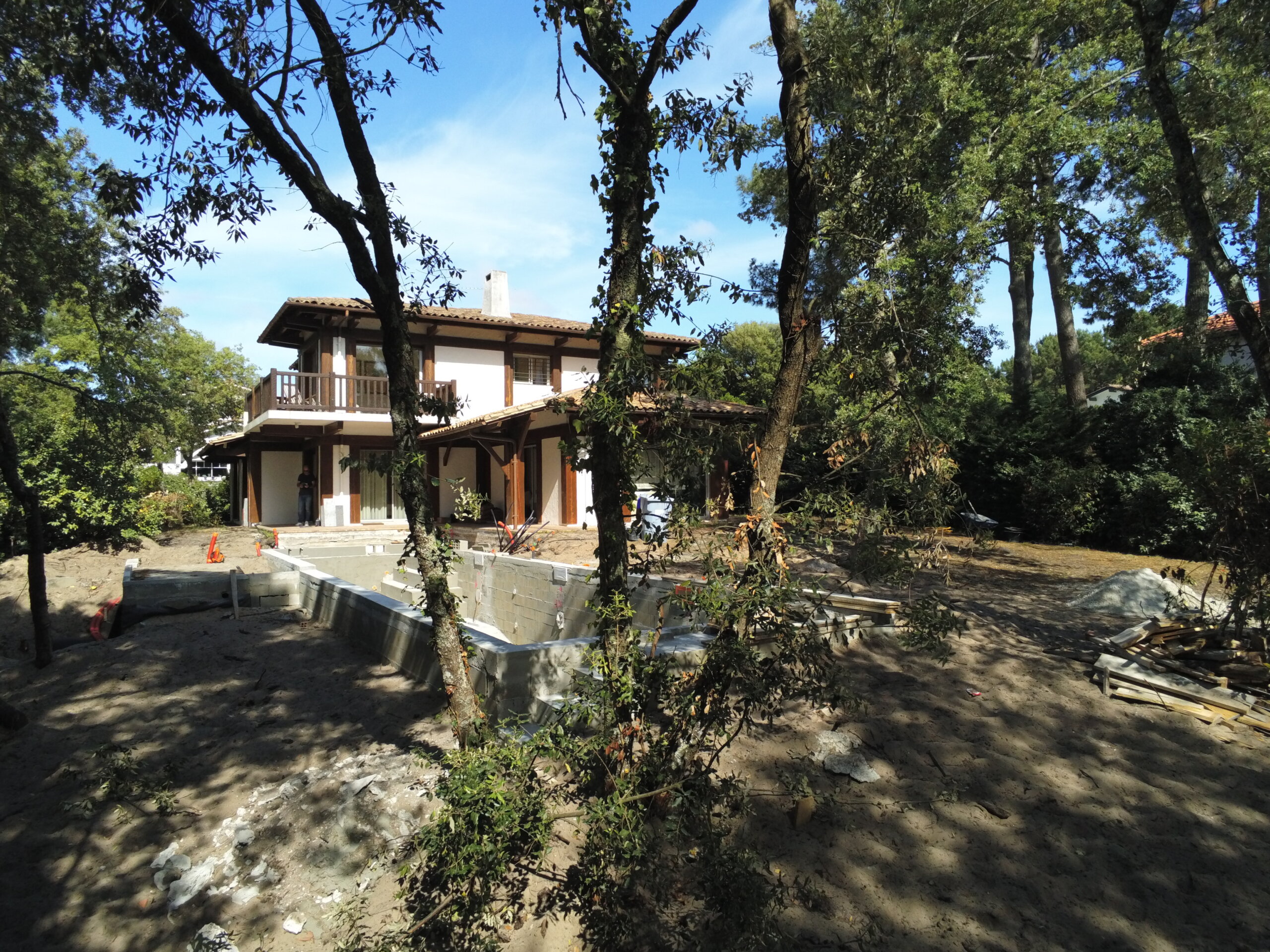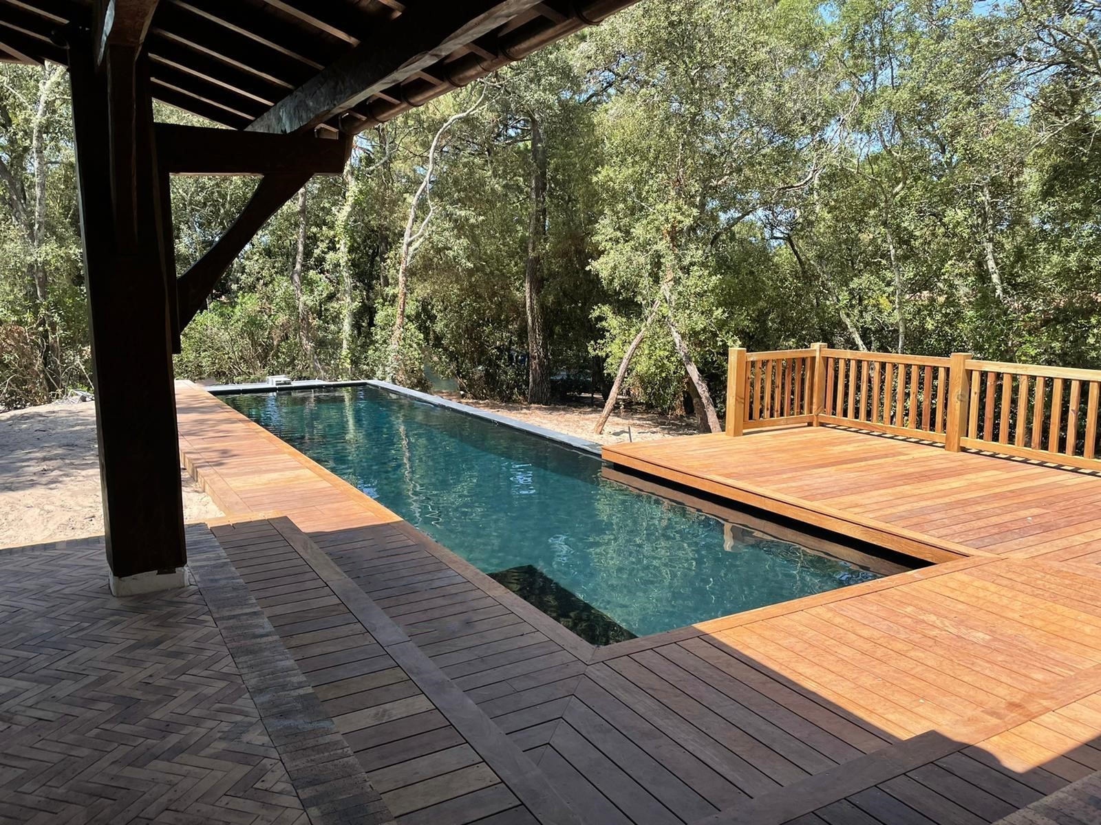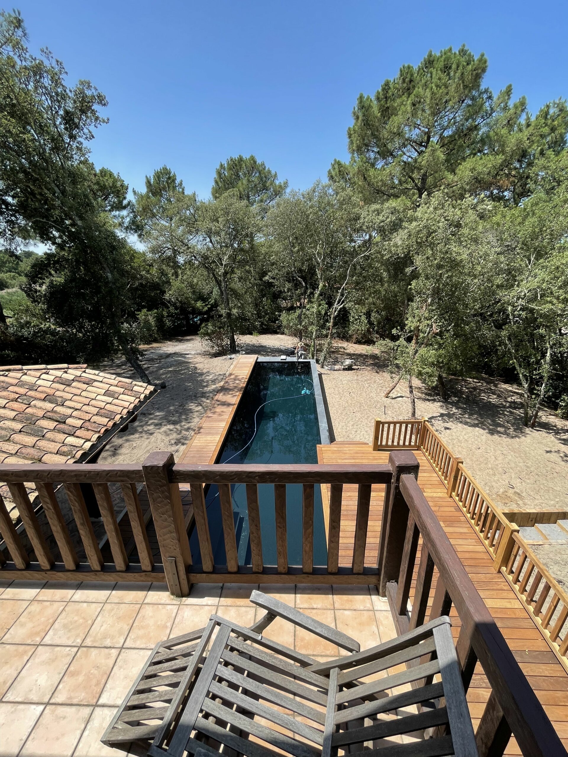 Pour ce chantier, nous avons également réalisé la construction du local technique maçonné, la pose des barrières en bois, la fourniture et l’installation des margelles, la création de la terrasse en IPE, ainsi que l’aménagement complet du jardin.