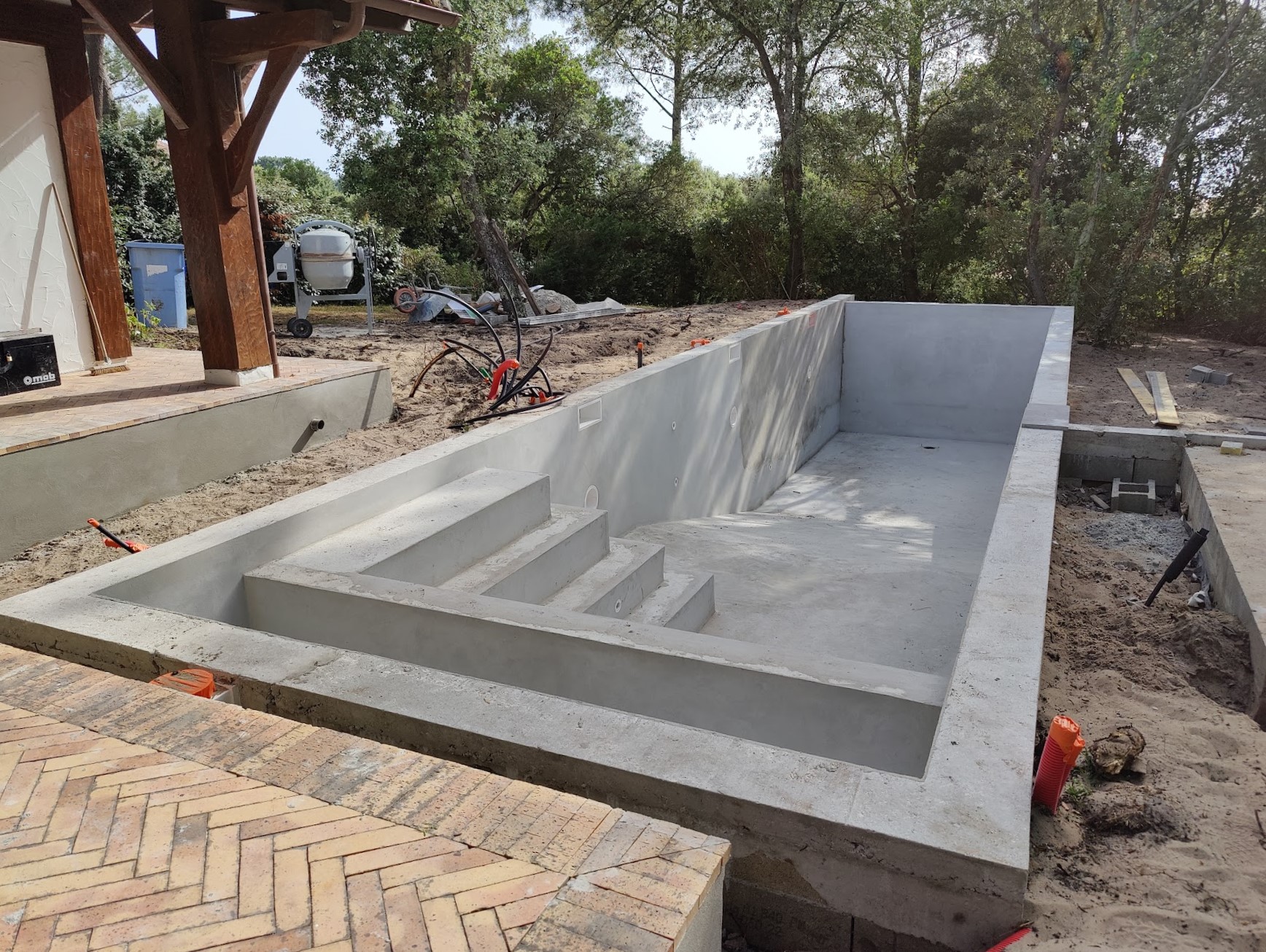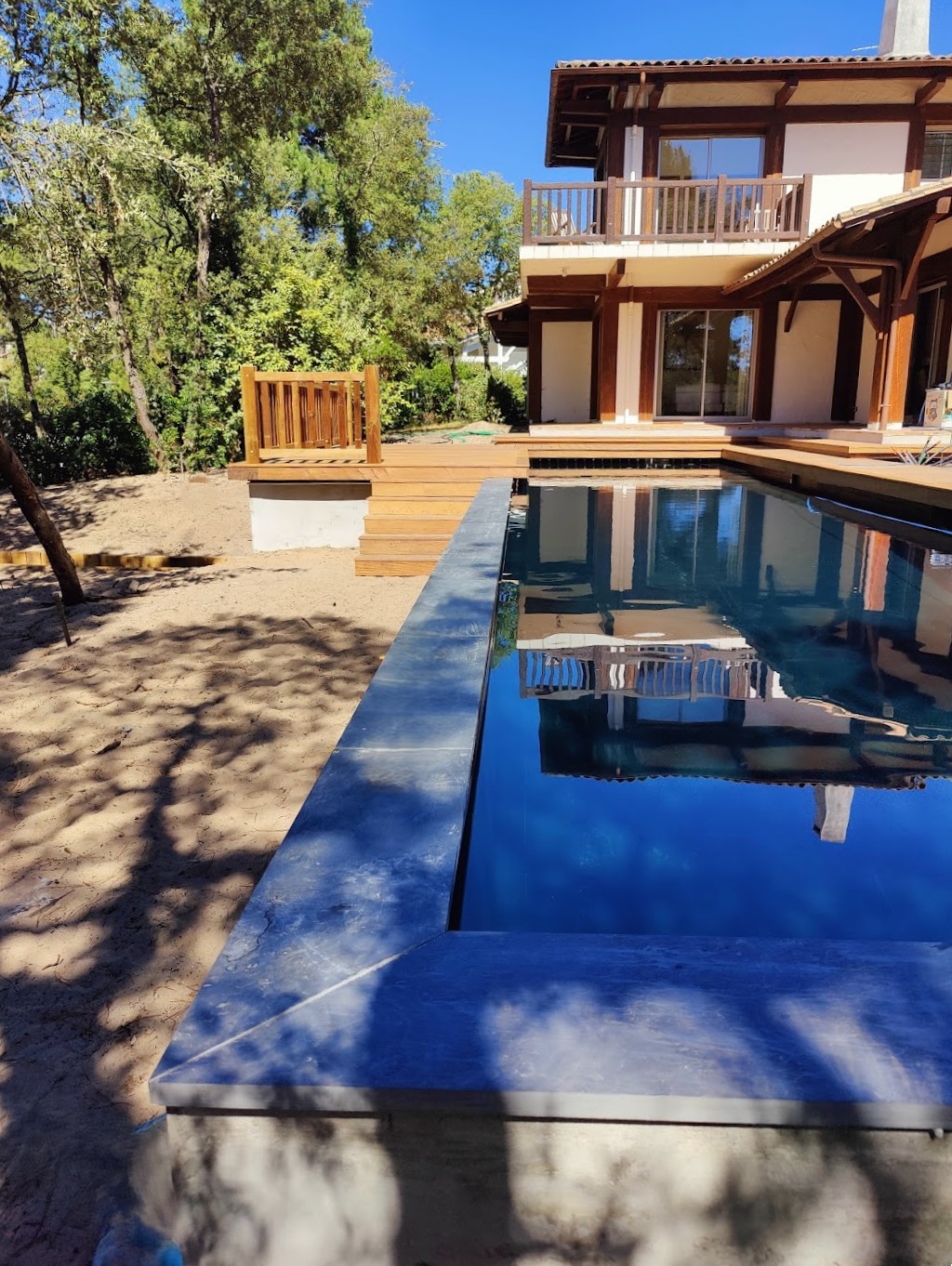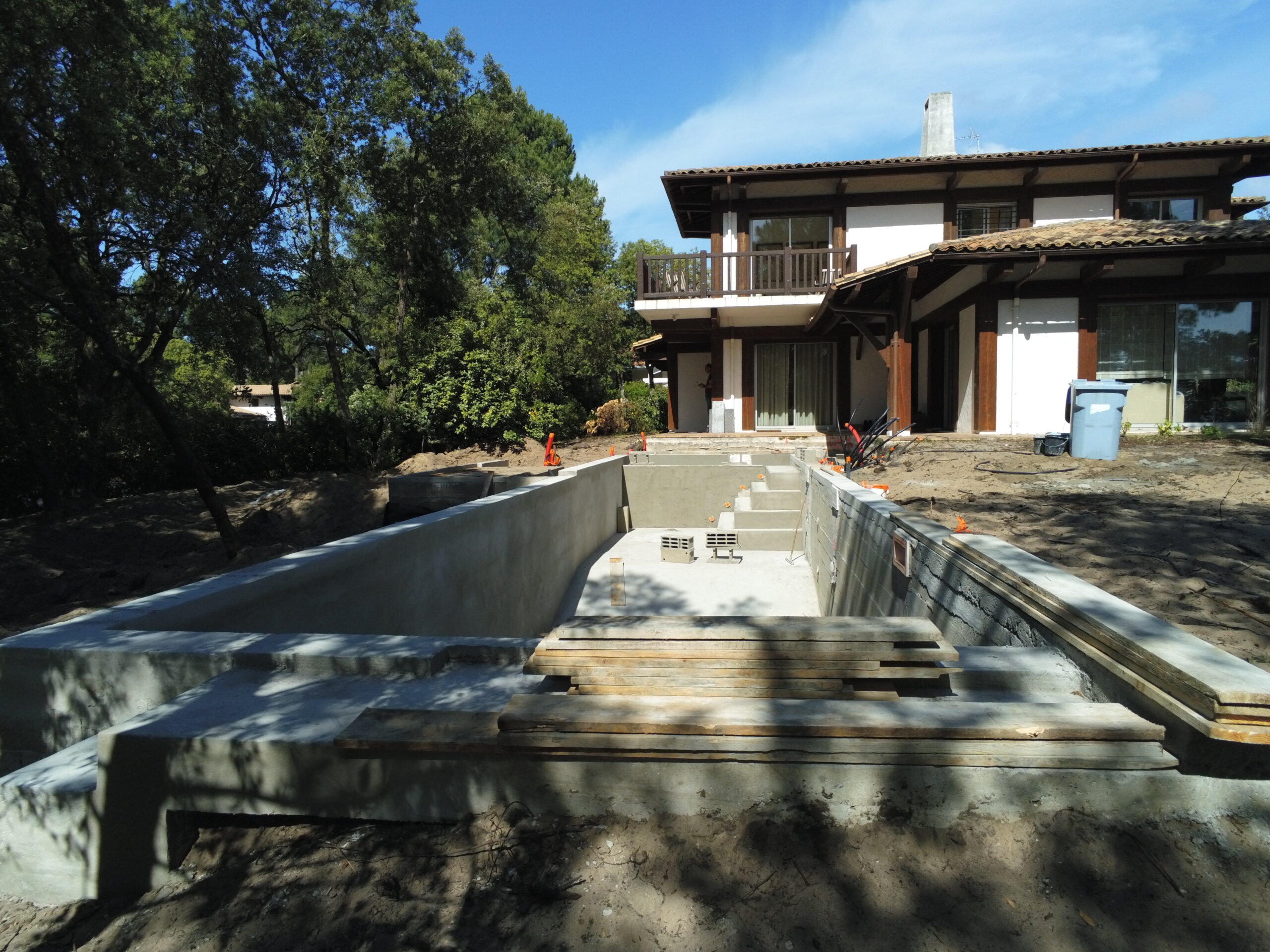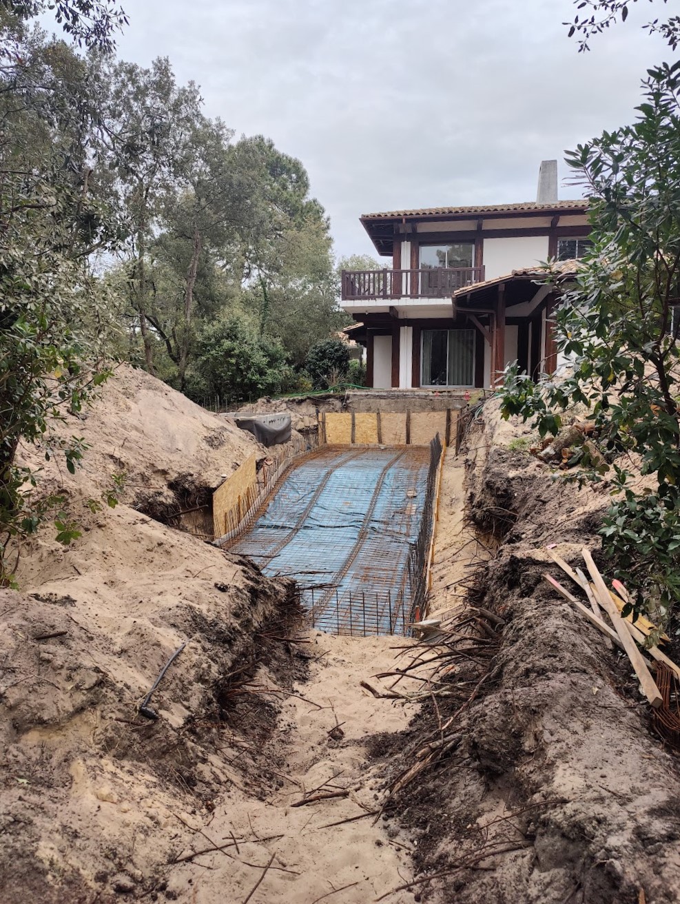 Pour ce chantier, nous avons également réalisé la construction du local technique maçonné, la pose des barrières en bois, la fourniture et l’installation des margelles, la création de la terrasse en IPE, ainsi que l’aménagement complet du jardin.