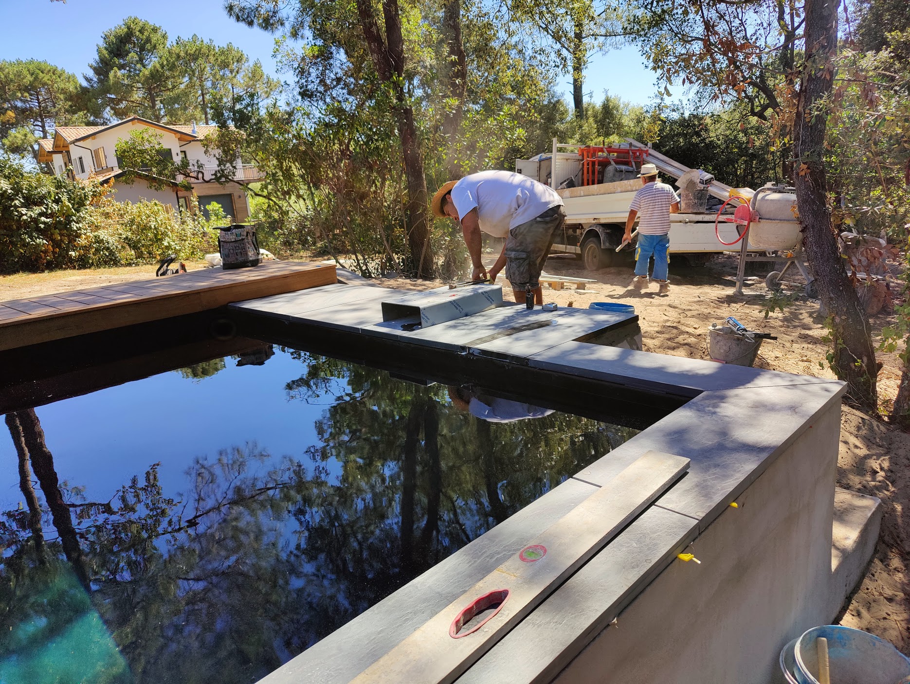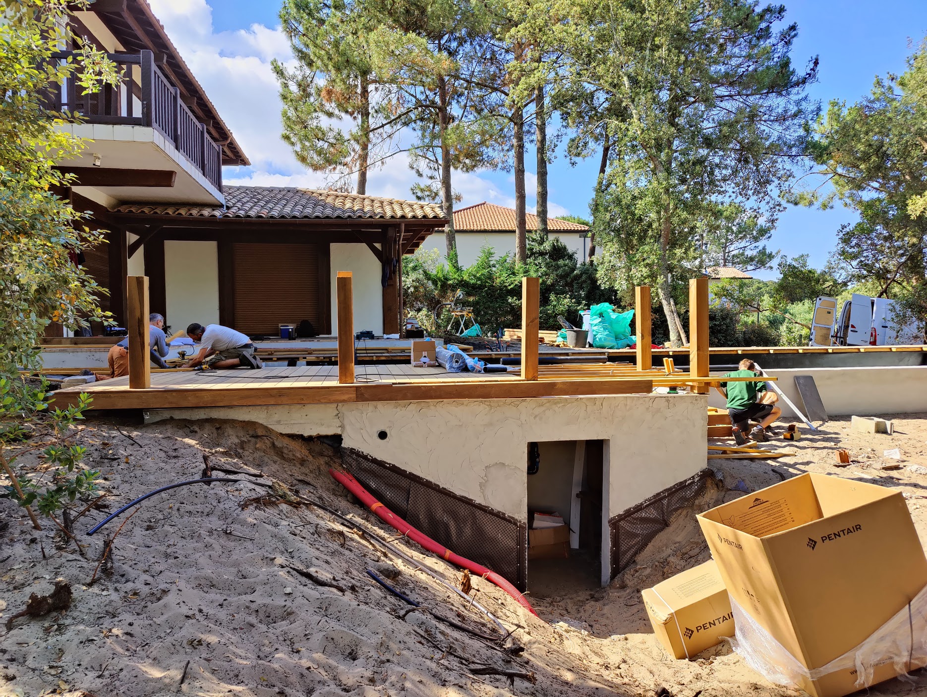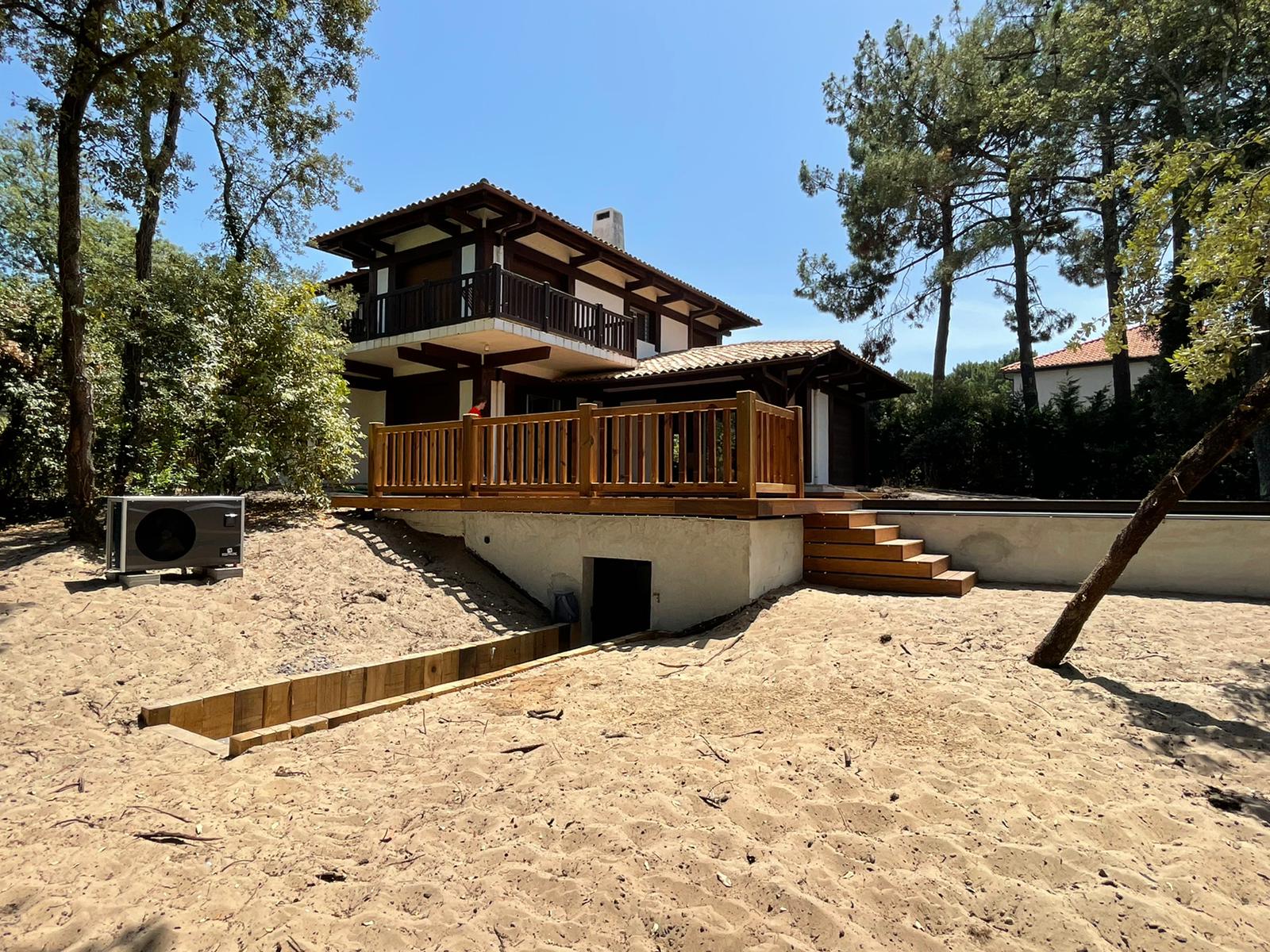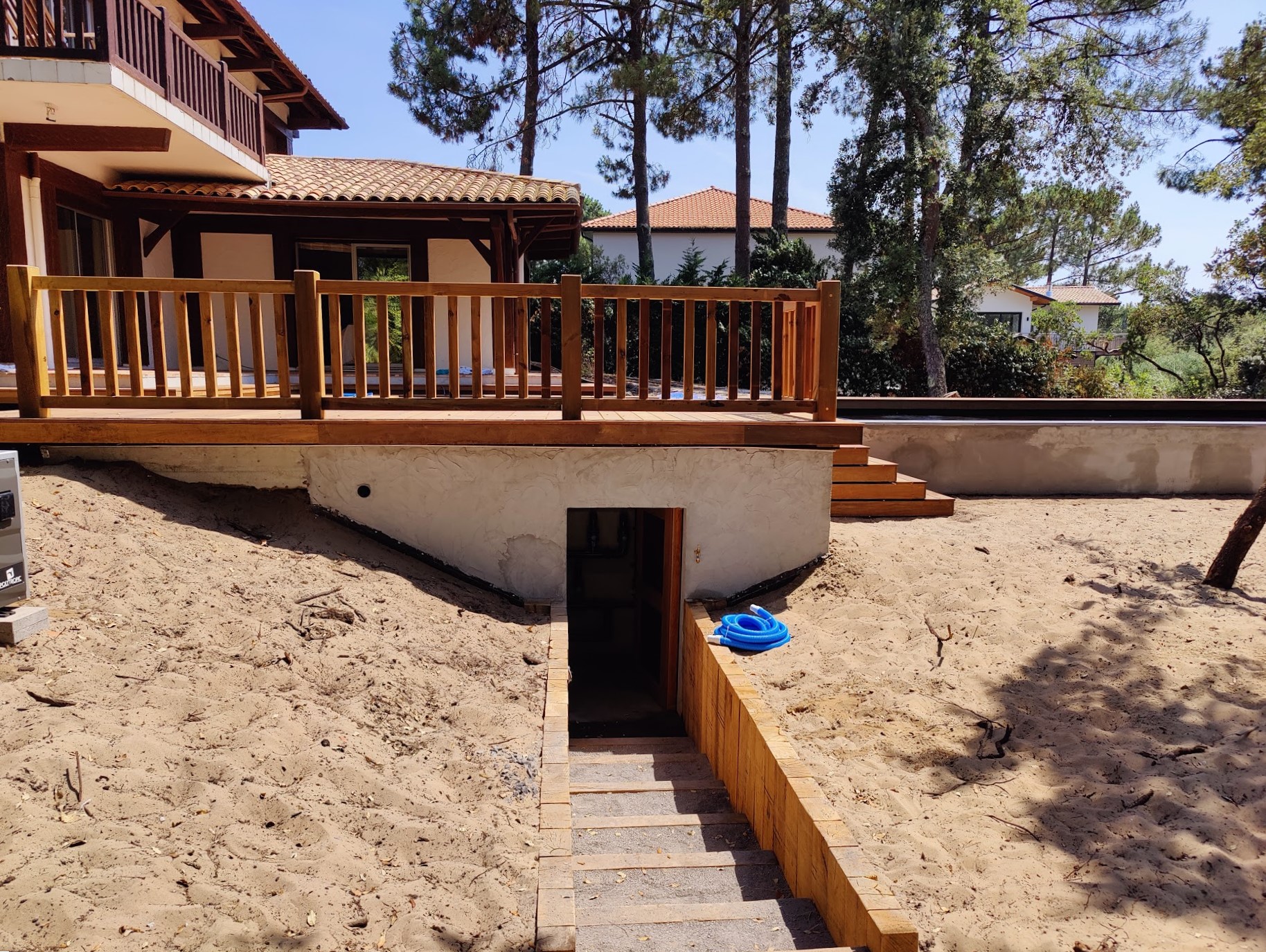 Pour ce chantier, nous avons également réalisé la construction du local technique maçonné, la pose des barrières en bois, la fourniture et l’installation des margelles, la création de la terrasse en IPE, ainsi que l’aménagement complet du jardin.