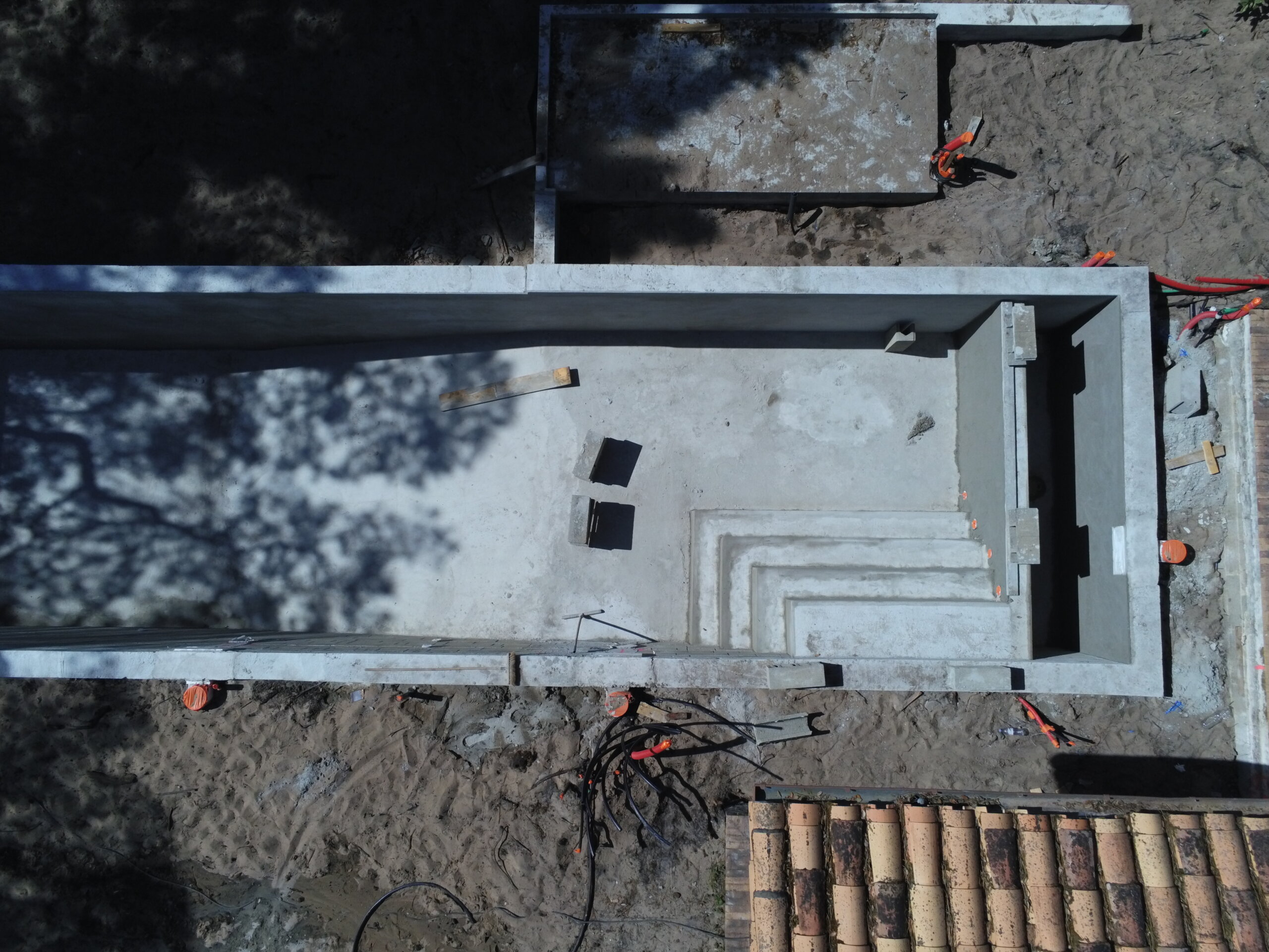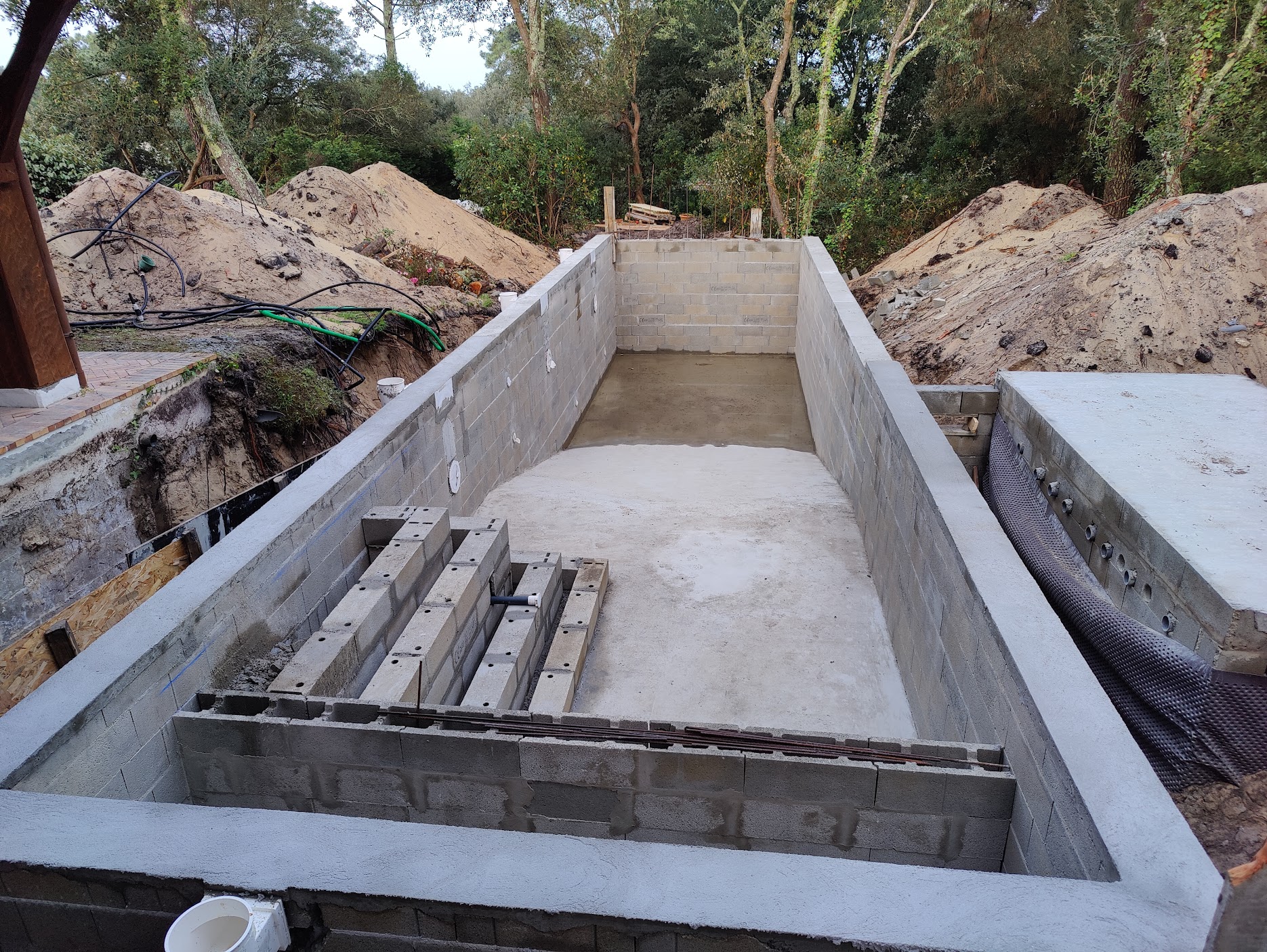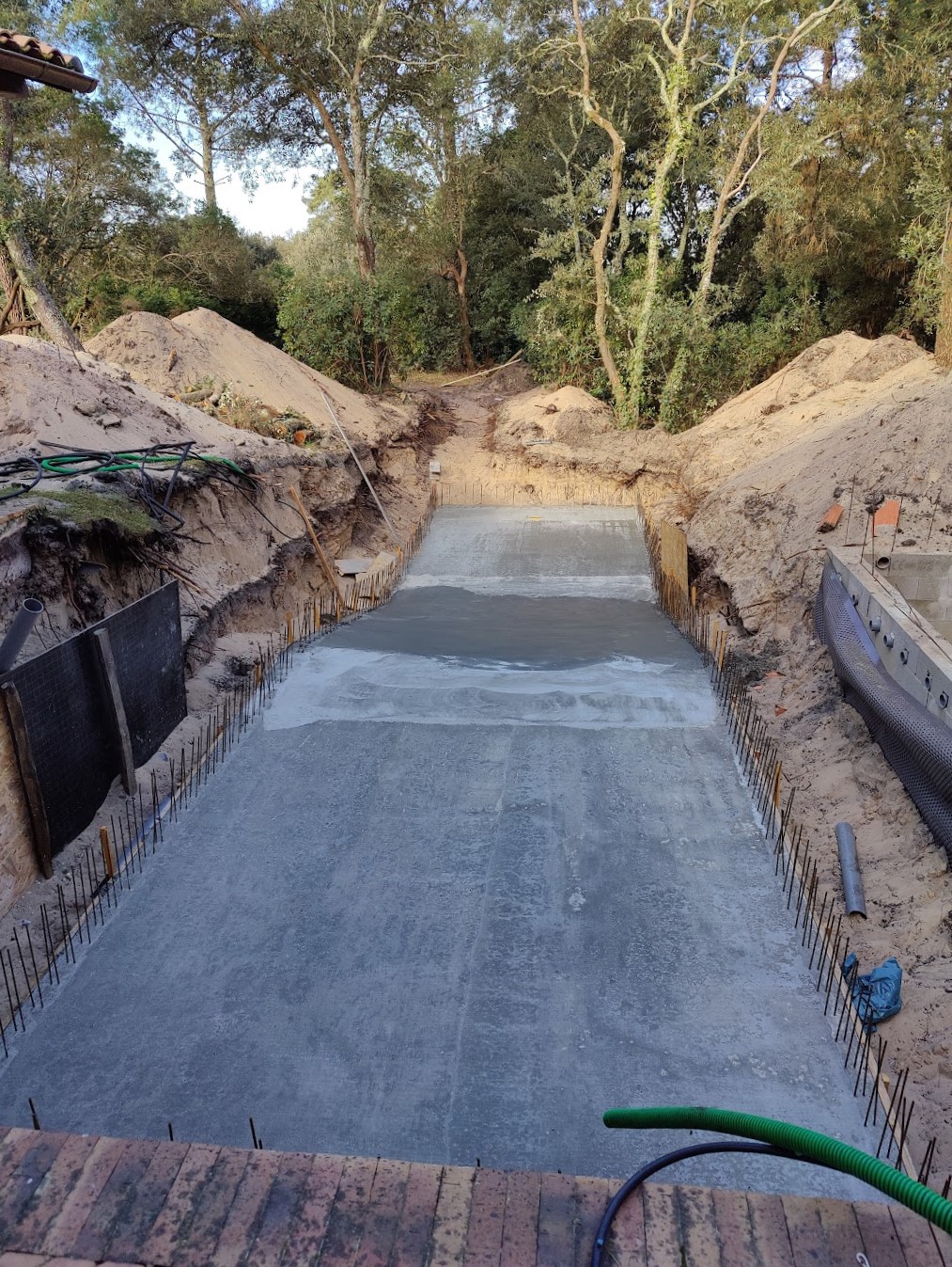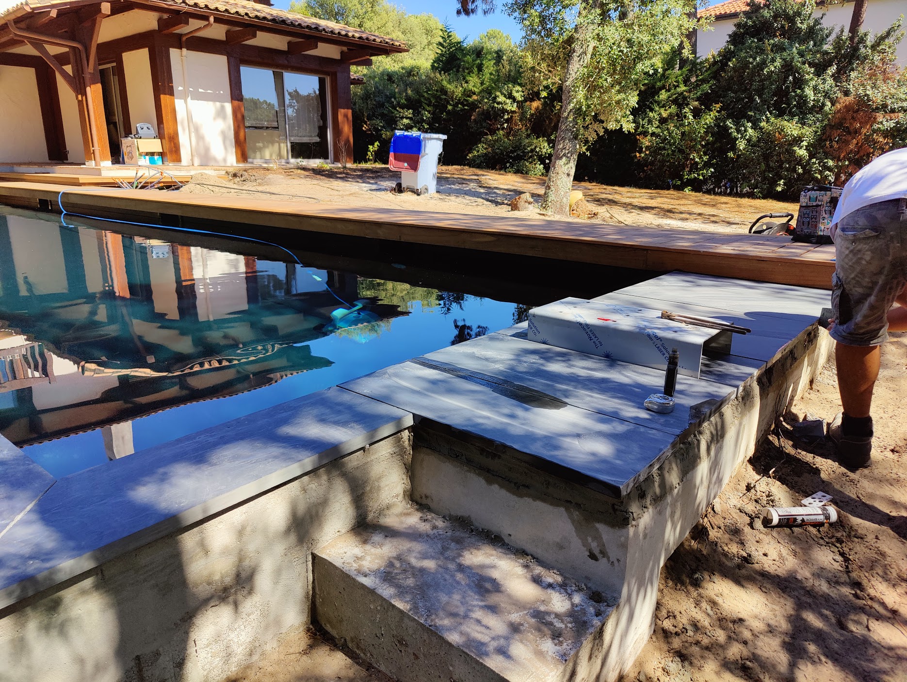Pour ce chantier, nous avons également réalisé la construction du local technique maçonné, la pose des barrières en bois, la fourniture et l’installation des margelles, la création de la terrasse en IPE, ainsi que l’aménagement complet du jardin.