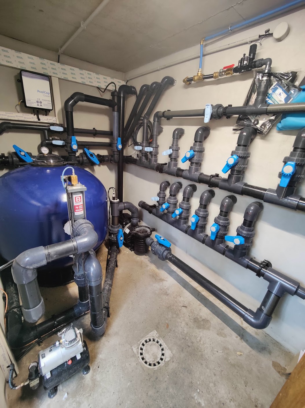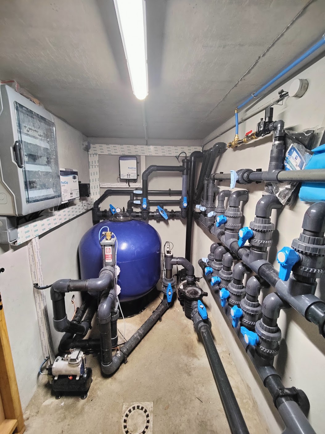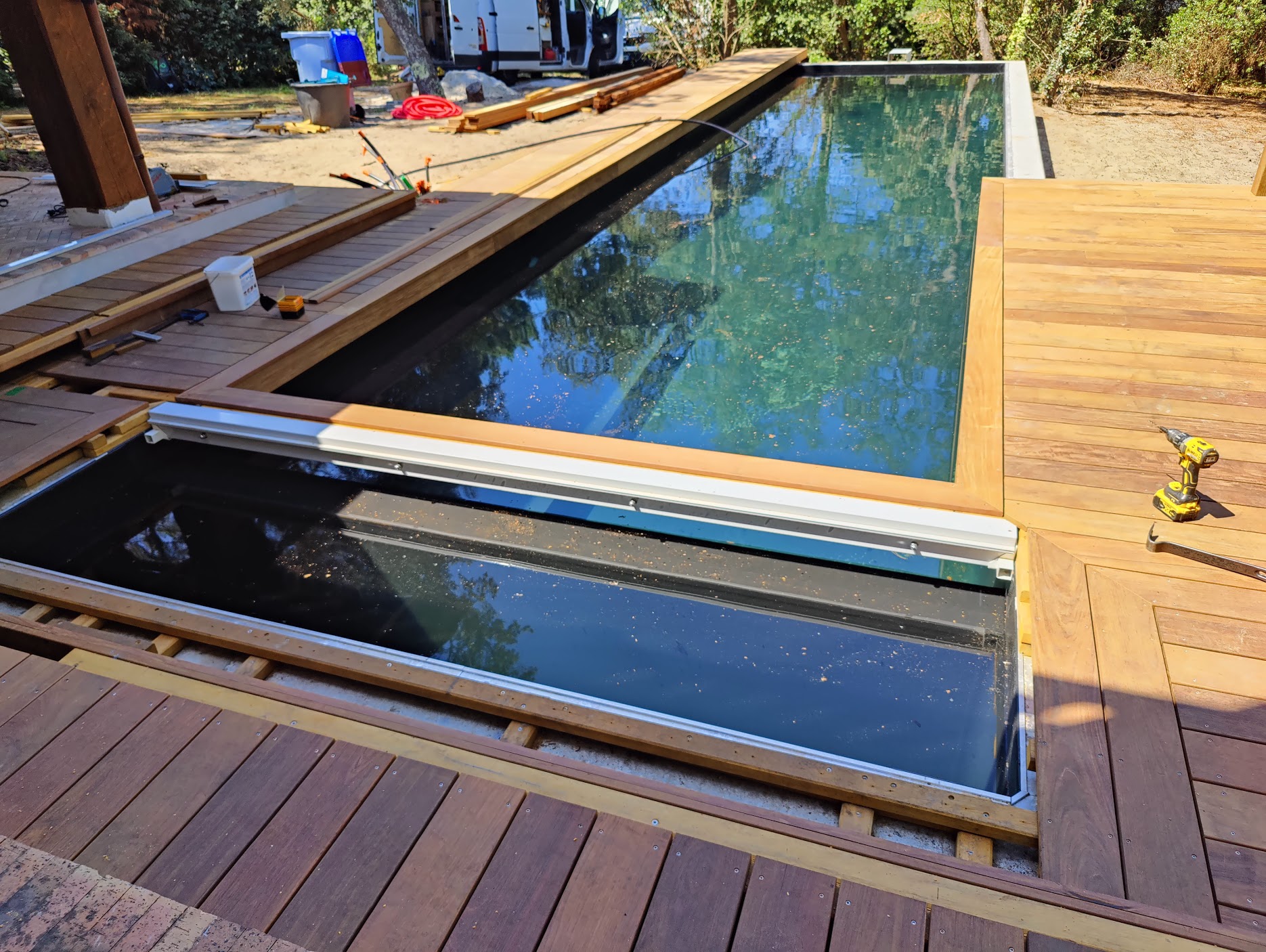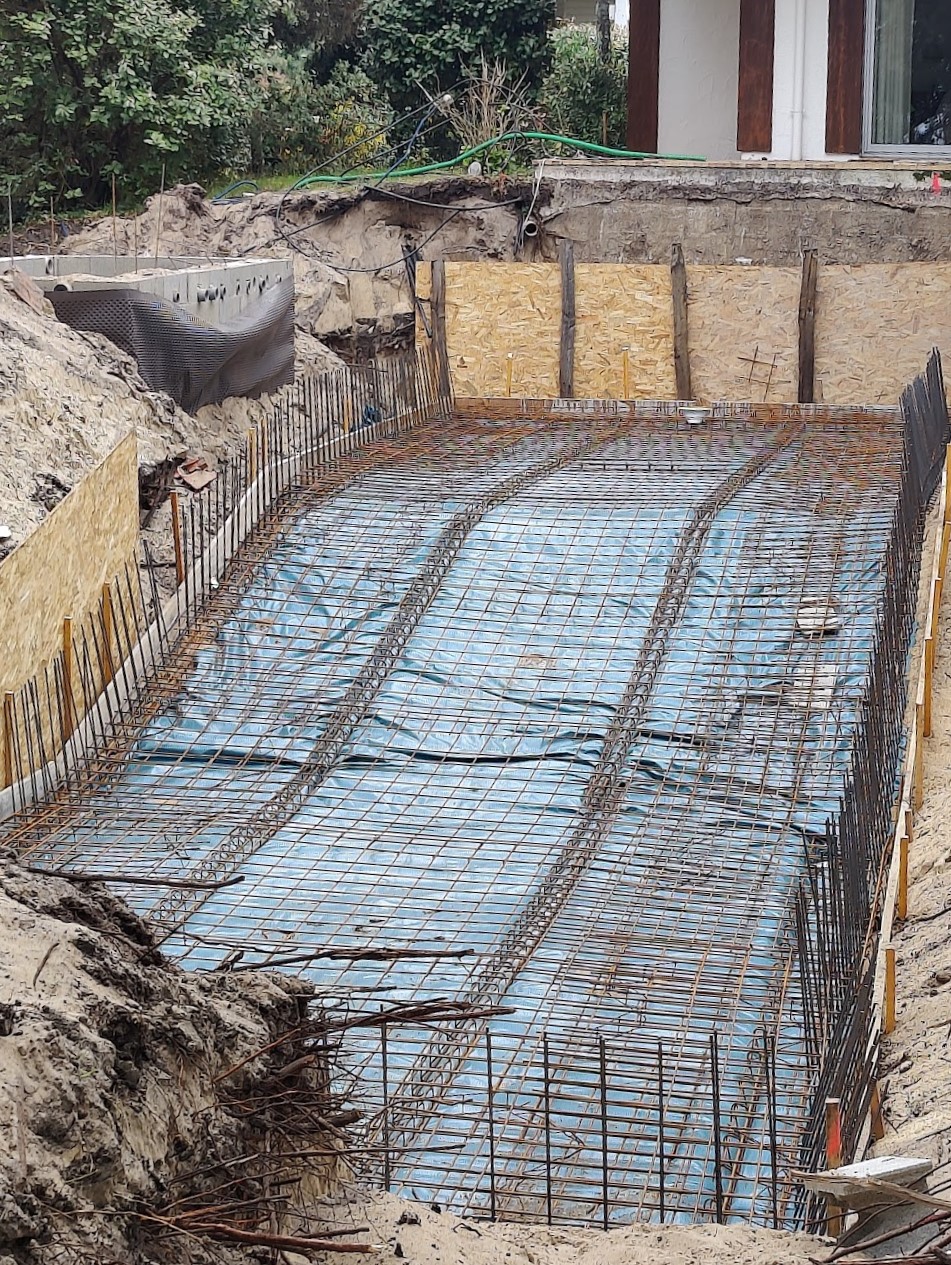 Type d’aménagement : Terrassement, maçonnerie, filtration, pompe, électrolyseur, membrane armée, pompe à chaleur et volet immergé.